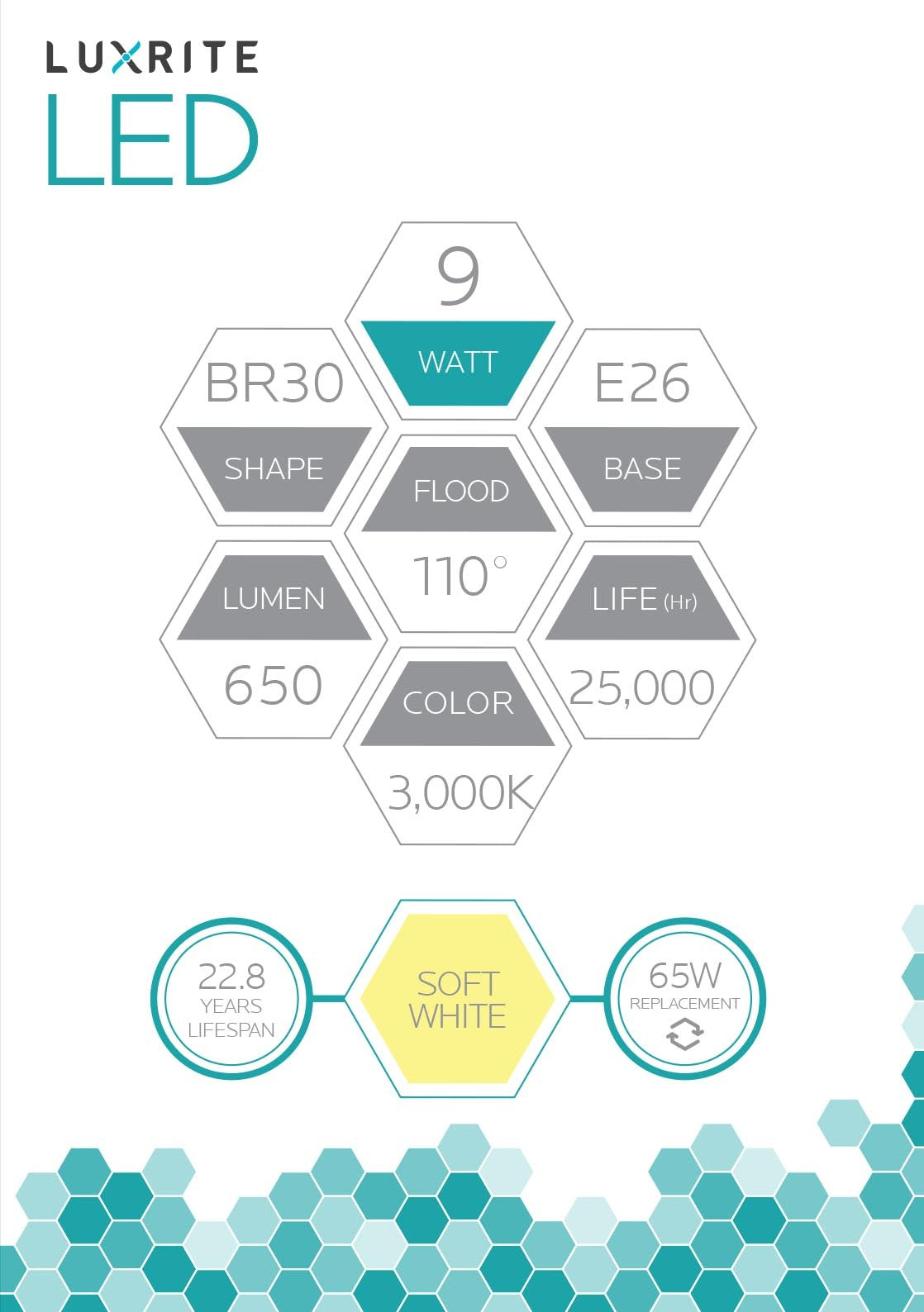 Luxrite LED BR30 Reflector Light Bulb, 9W, 650 Lumens, 3000K - Soft White, 80 CRI, Frosted White Finish, Dimmable, Pack of 7 (LR31851)