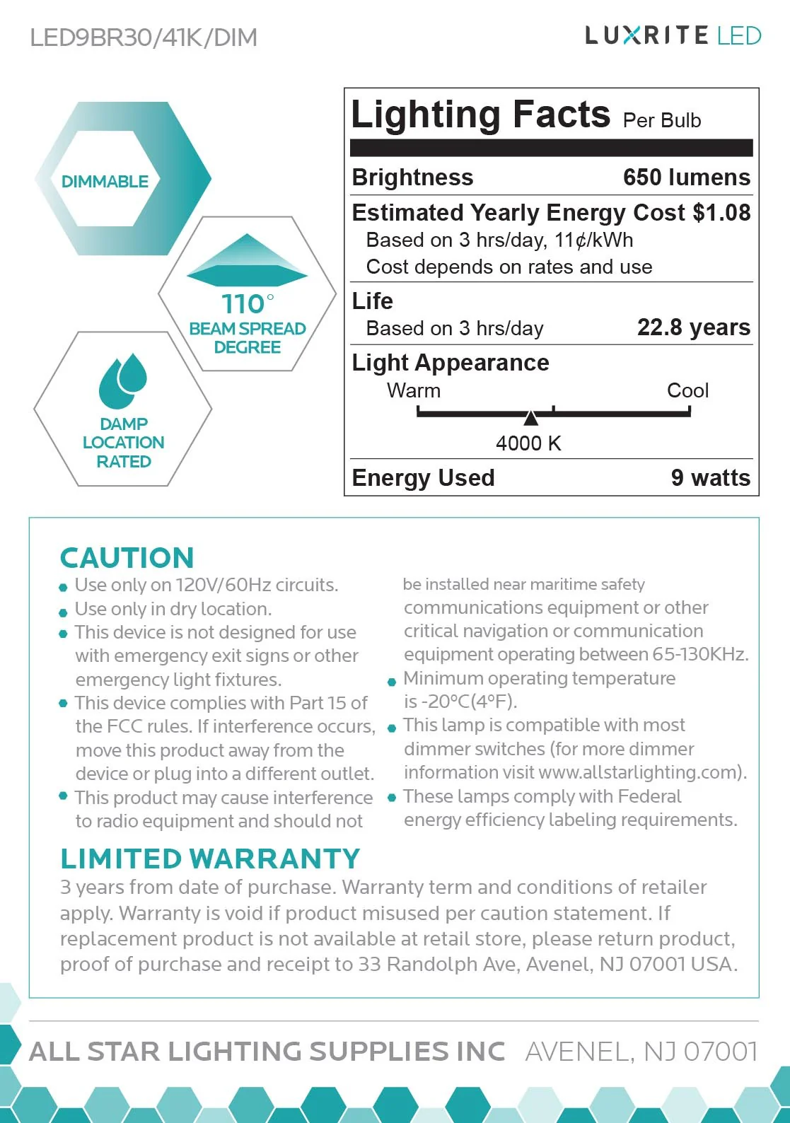 Luxrite LED BR30 Reflector Light Bulb, 9W, 650 Lumens, 4000K - Cool White, 80 CRI, Frosted White Finish, Dimmable (LR31853)