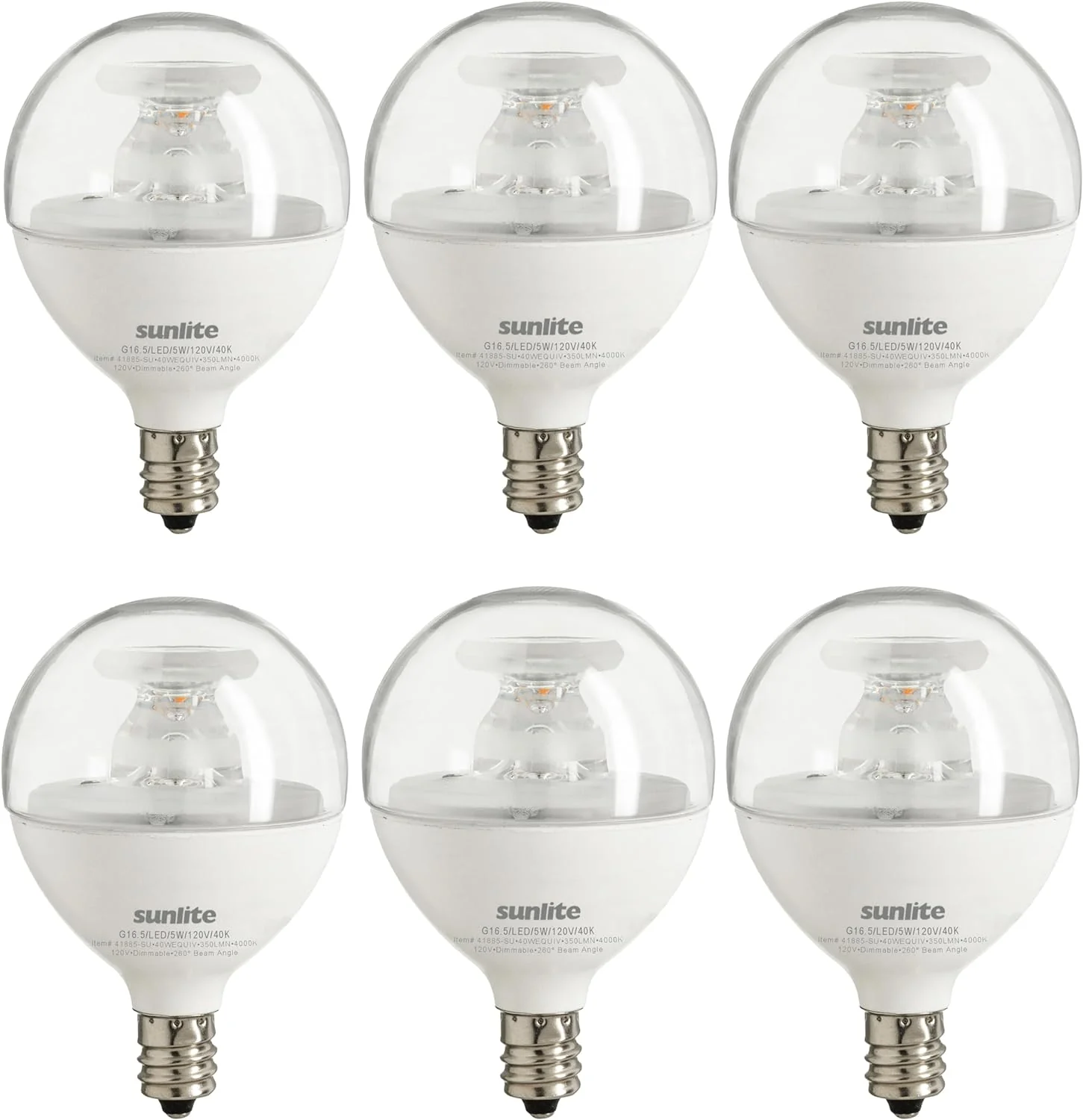 Sunlite LED G16.5 Clear Globe Light Bulb, 5 Watts (40W Equivalent), 350 lumens, Dimmable, Candelabra Base (E12), 120 Volts, ETL Listed, 260 Degree Beam Angle, 4000K Cool White, 6 Pack