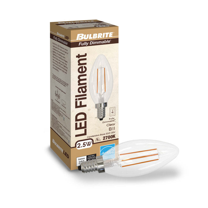 Bulbrite LED Filament 6.5 Watt Dimmable B11 Light Bulbs with a Clear Finish and Medium (E26) Base - 2700K (Warm White Light), 750 Lumens