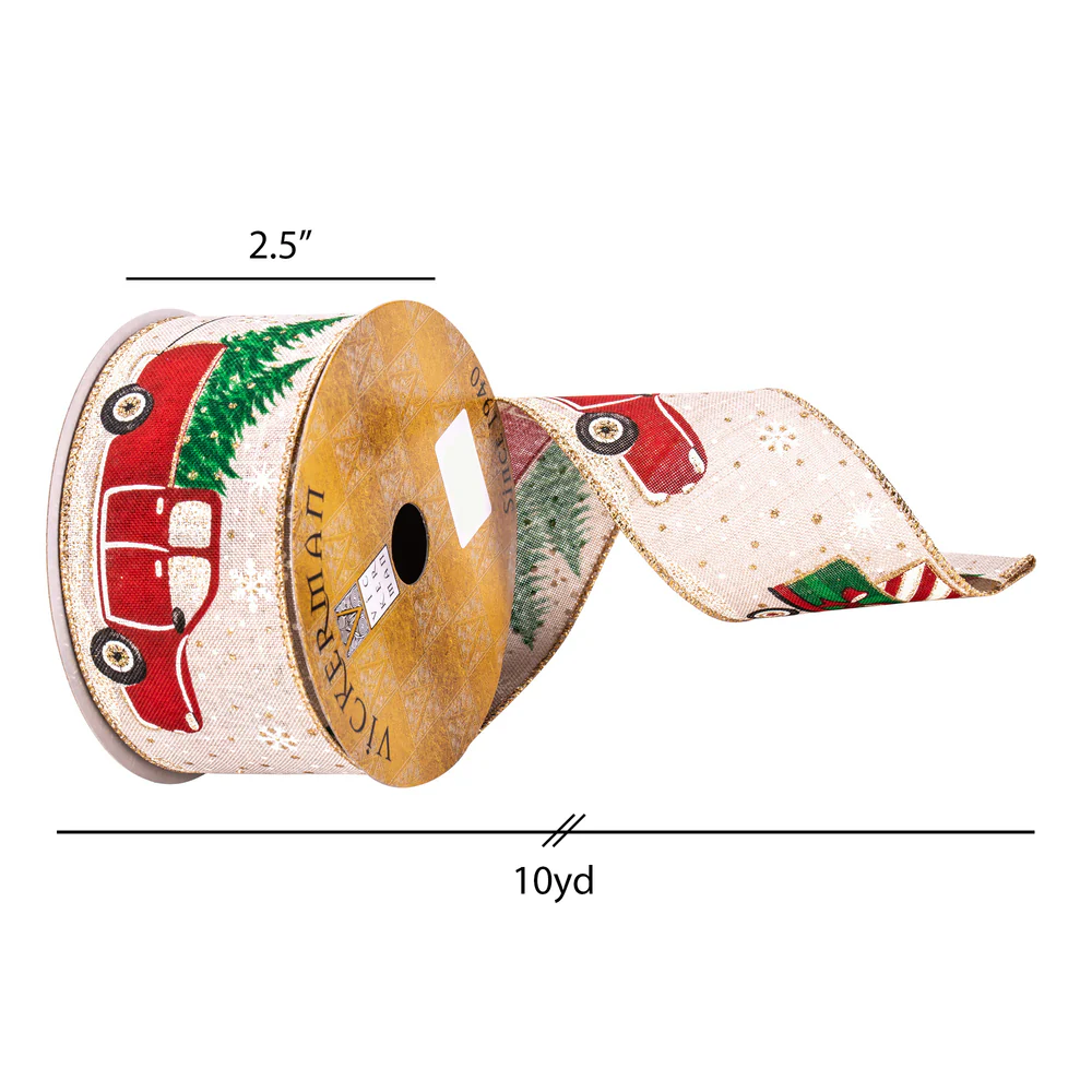 Vickerman 2.5" x 10 Yards Red Green and Beige Truck and Wagon Ribbon