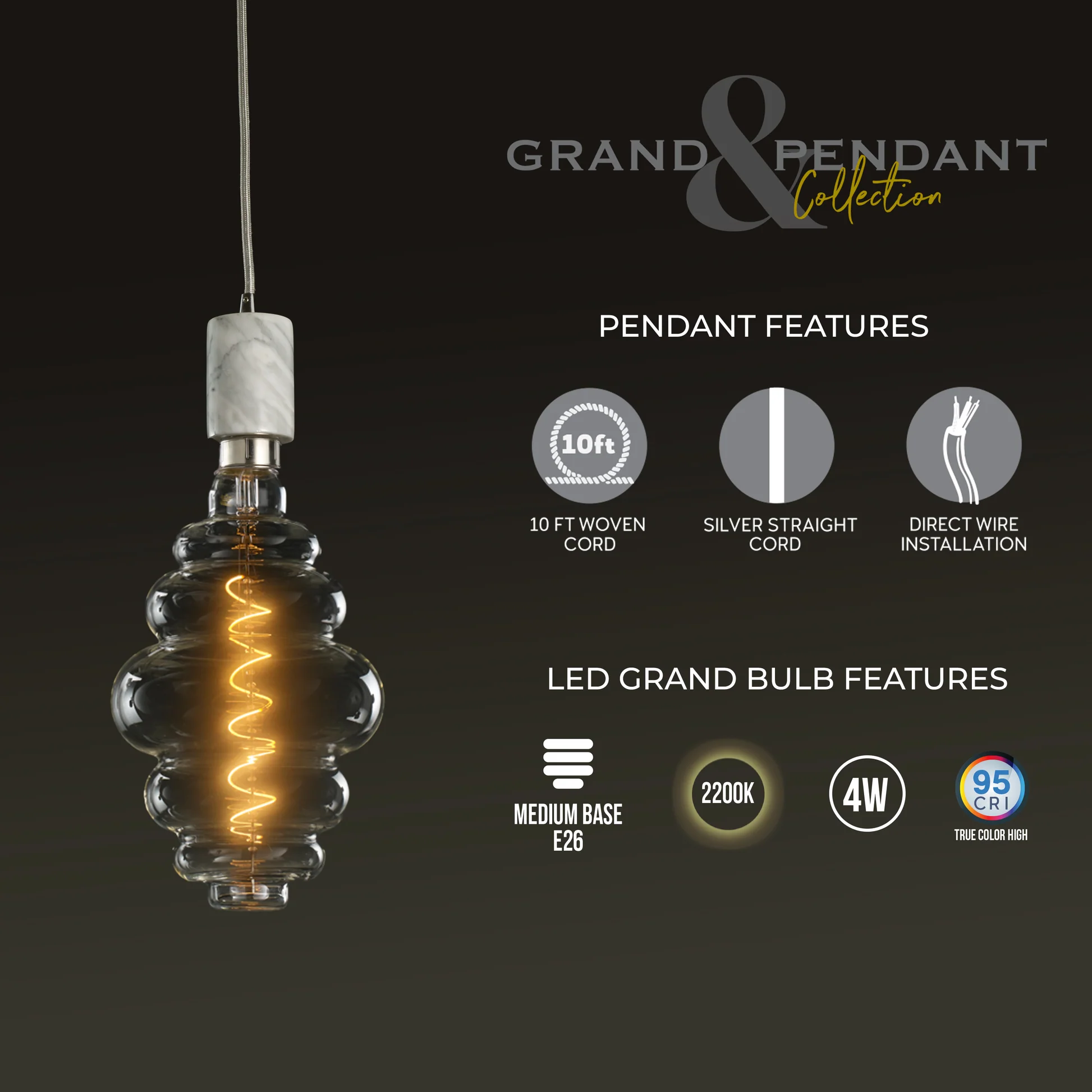 BULBRITE FIXTURES DIRECT WIRE PENDANT KIT NATURAL MARBLE SOCKET IN BLACK WITH BLACK CORD AND INCANDESCENT DIAMOND SHAPED MEDIUM SCREW (E26) 60W DIMMABLE GRAND NOSTALGIC LIGHT BULB 2200K/AMBER 1PK (810083)