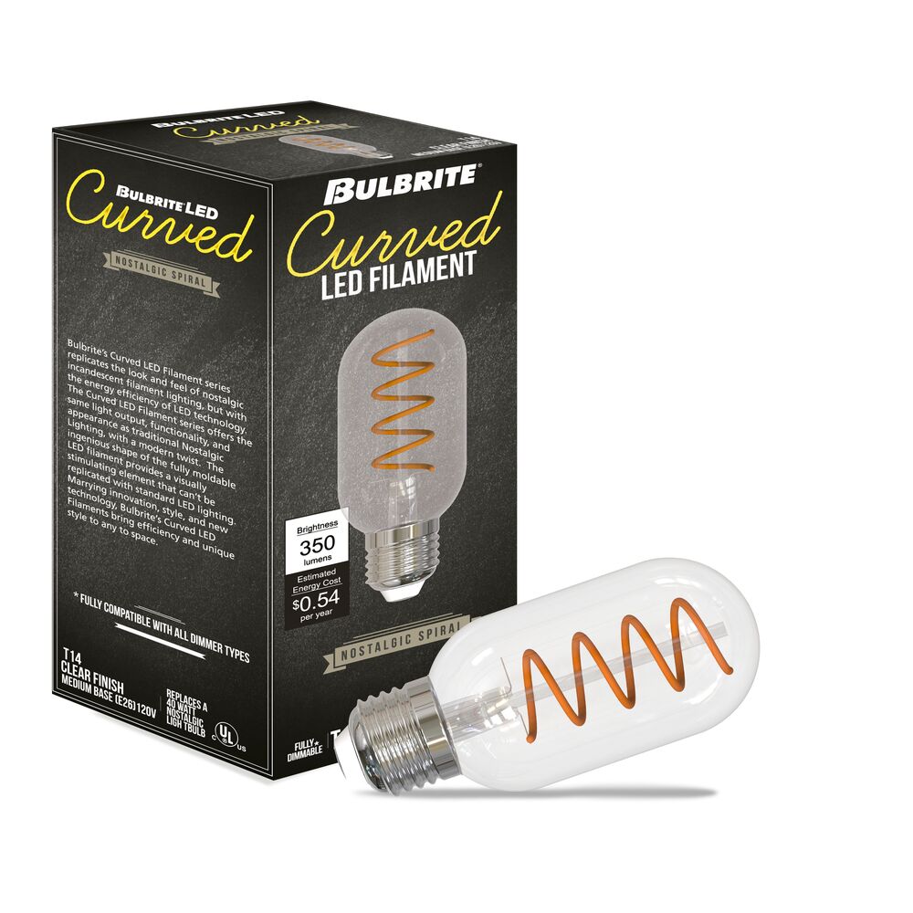 Bulbrite LED T14 Curved Filament Spiral, Dimmable E26 Medium Base, Clear Finish, 2100K-Amber Light 4 Watt, 4-Pack