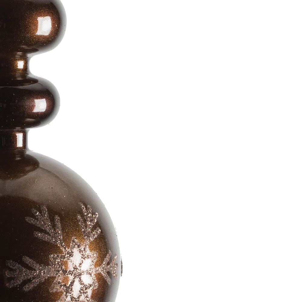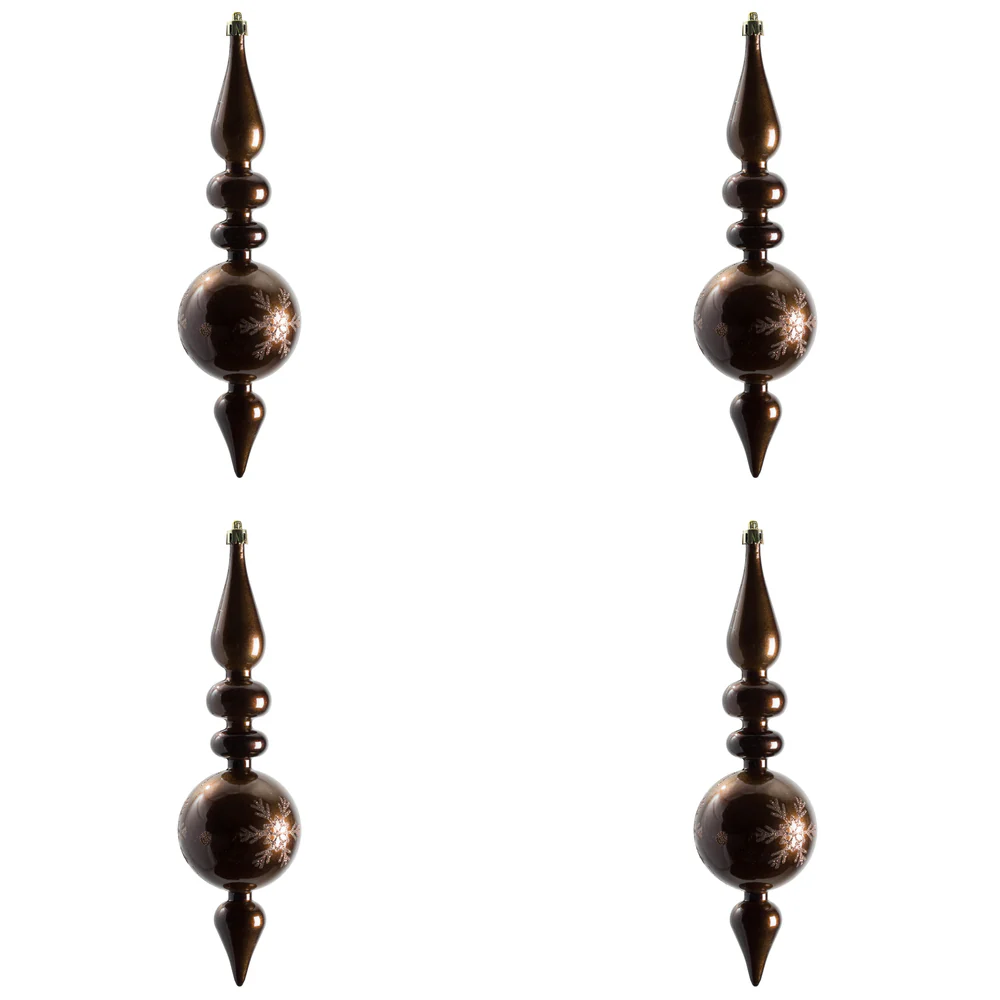 Vickerman 10 by 2.4" Chocolate Candy Glitter Snowflake Finial 4/Bag. Add some sparkle and shine to your holiday decorating projects with this 10 inch finial ornament. Made with shatterproof plastic. Ornament has a drilled cap secured with green flora