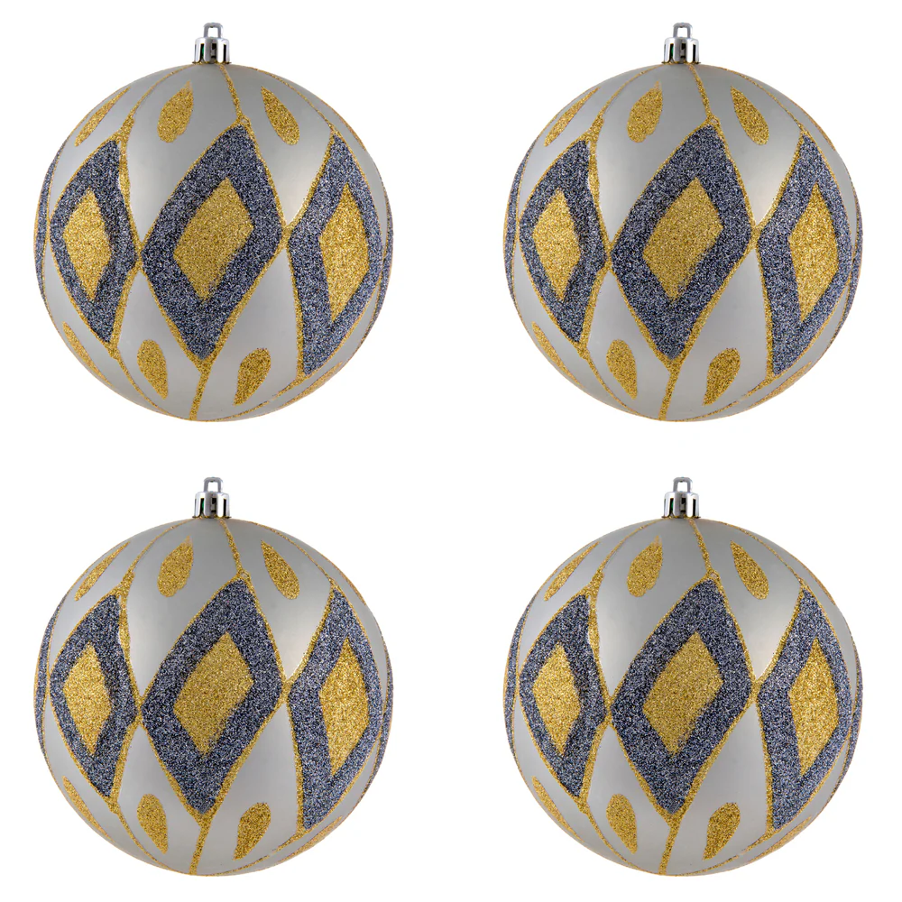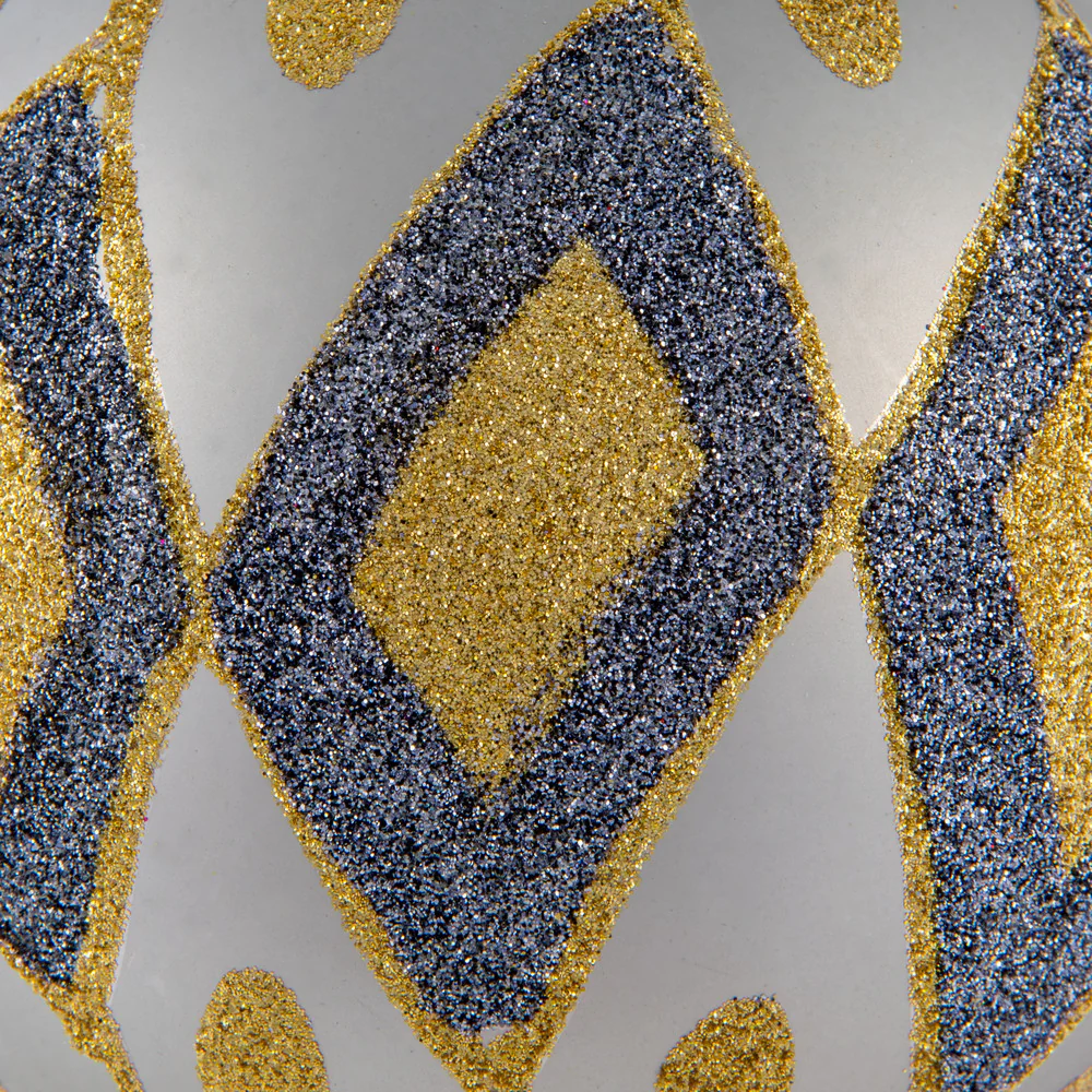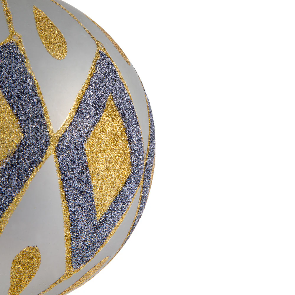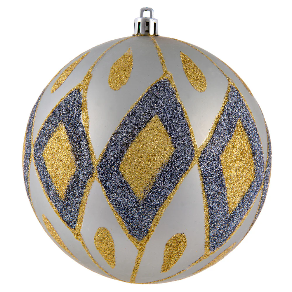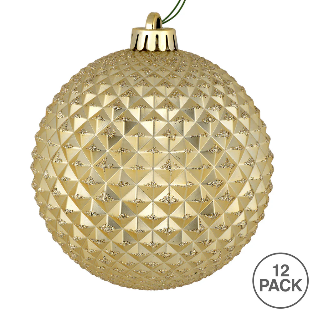 Vickerman 4.75" Limestone Matte Ball with Glitter Diamond Pattern. Add variety and sparkle to your holiday arrangement with this matte ornament that features a glitter pattern. Includes 4 pieces per bag. Made with shatterproof plastic. Ornament has a