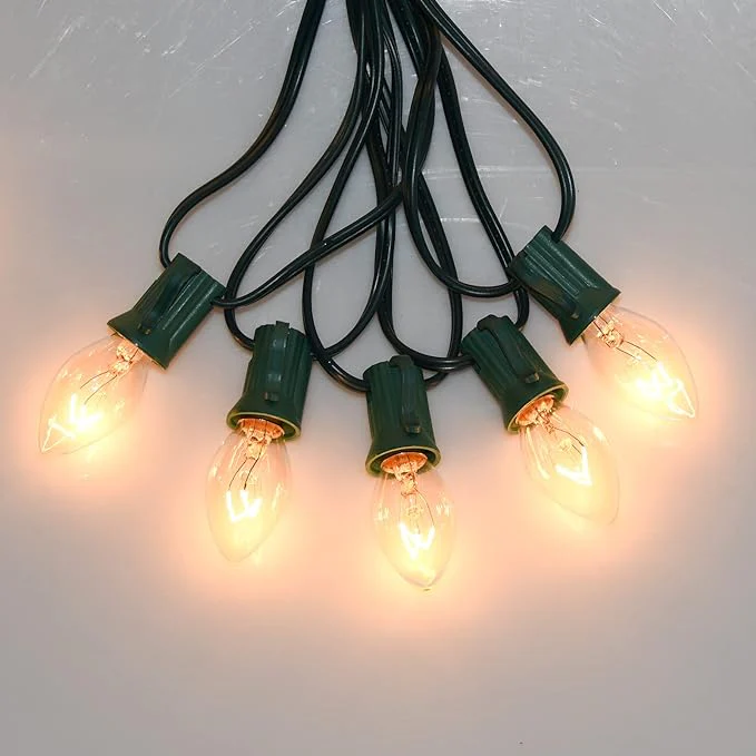 Clear Finish Christmas Light String Set, C7 Shape, 12 Foot, Candelabra Base, Green Wire, 25 String Light with 12" Spacing Between Lights