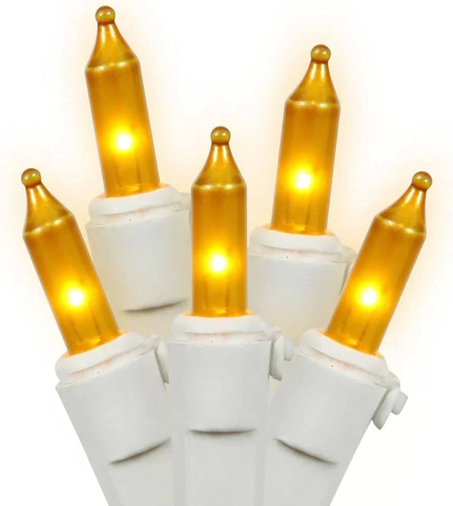 Transparent Amber Christmas Tree Mini Lights, 50 Lights, T1 3/4 Shaped, 16 Foot, White Wire, Steady Burning and Flashing