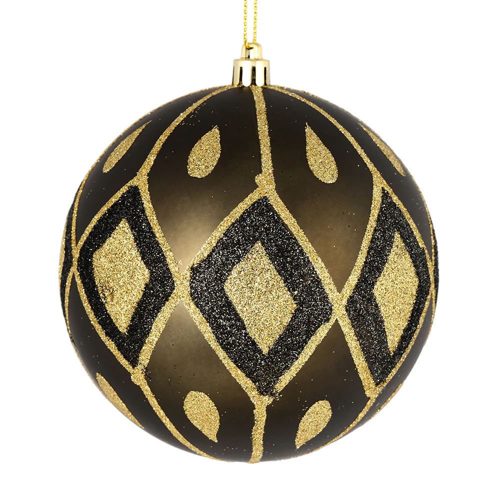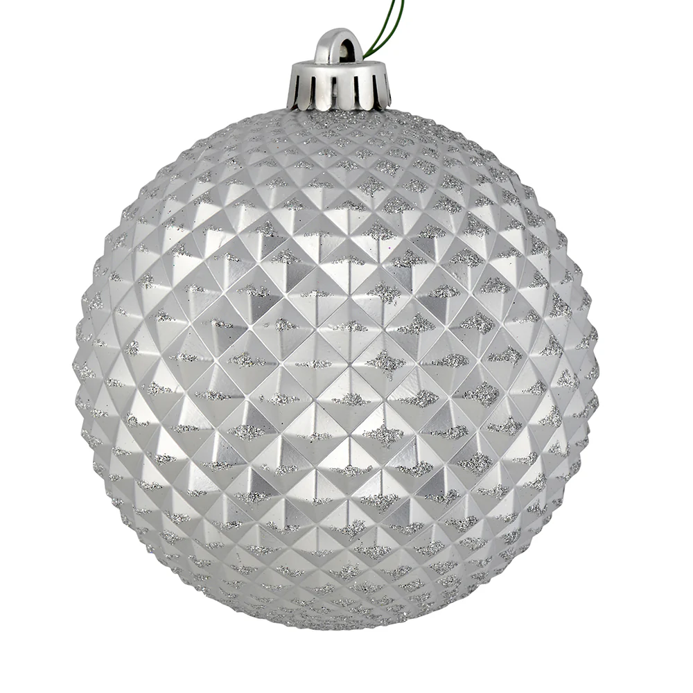 Vickerman 6" Gunmetal Matte Ball with Glitter Diamond Pattern. Add variety and sparkle to your holiday arrangement with this matte ornament that features a glitter pattern. Includes 3 pieces per bag. Made with shatterproof plastic. Ornament has a dri