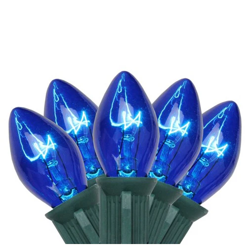 Blue Finish Christmas Light String Set, C7 Shape, 12 Foot, Candelabra Base, Green Wire, 25 String Light with 12" Spacing Between Lights