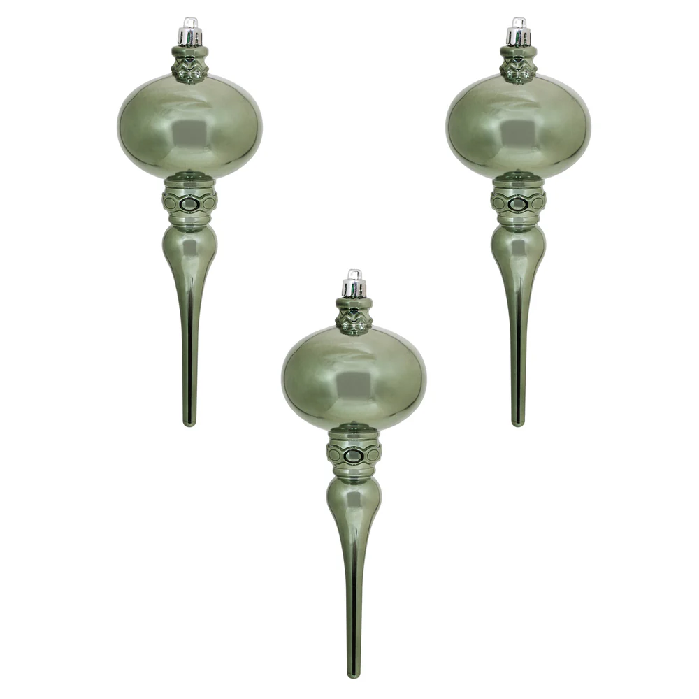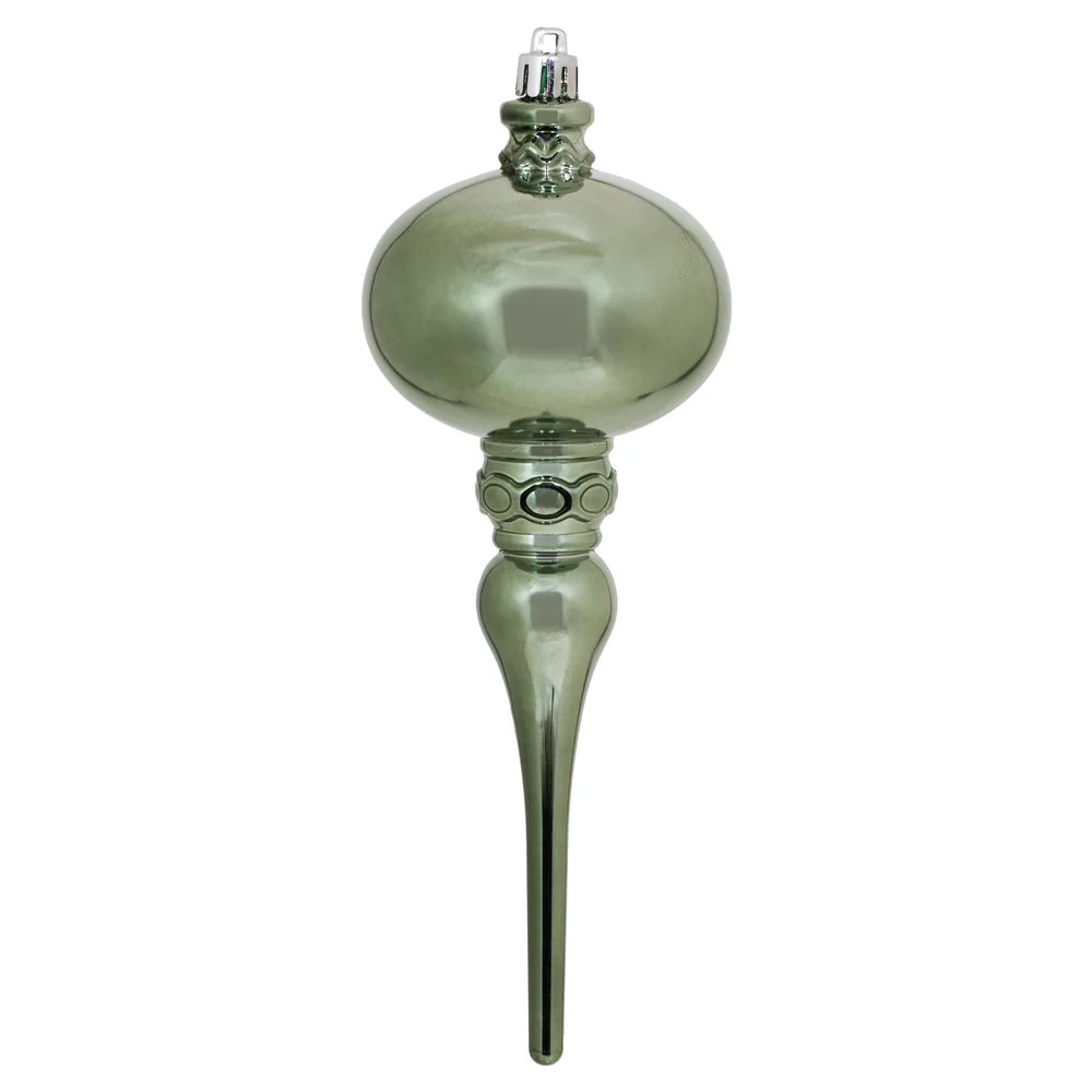 Vickerman 10 by 2.4" Seafoam Green Candy Glitter Snowflake Finial 4/Bag. Add some sparkle and shine to your holiday decorating projects with this 10 inch finial ornament. Made with shatterproof plastic. Ornament has a drilled cap secured with green f