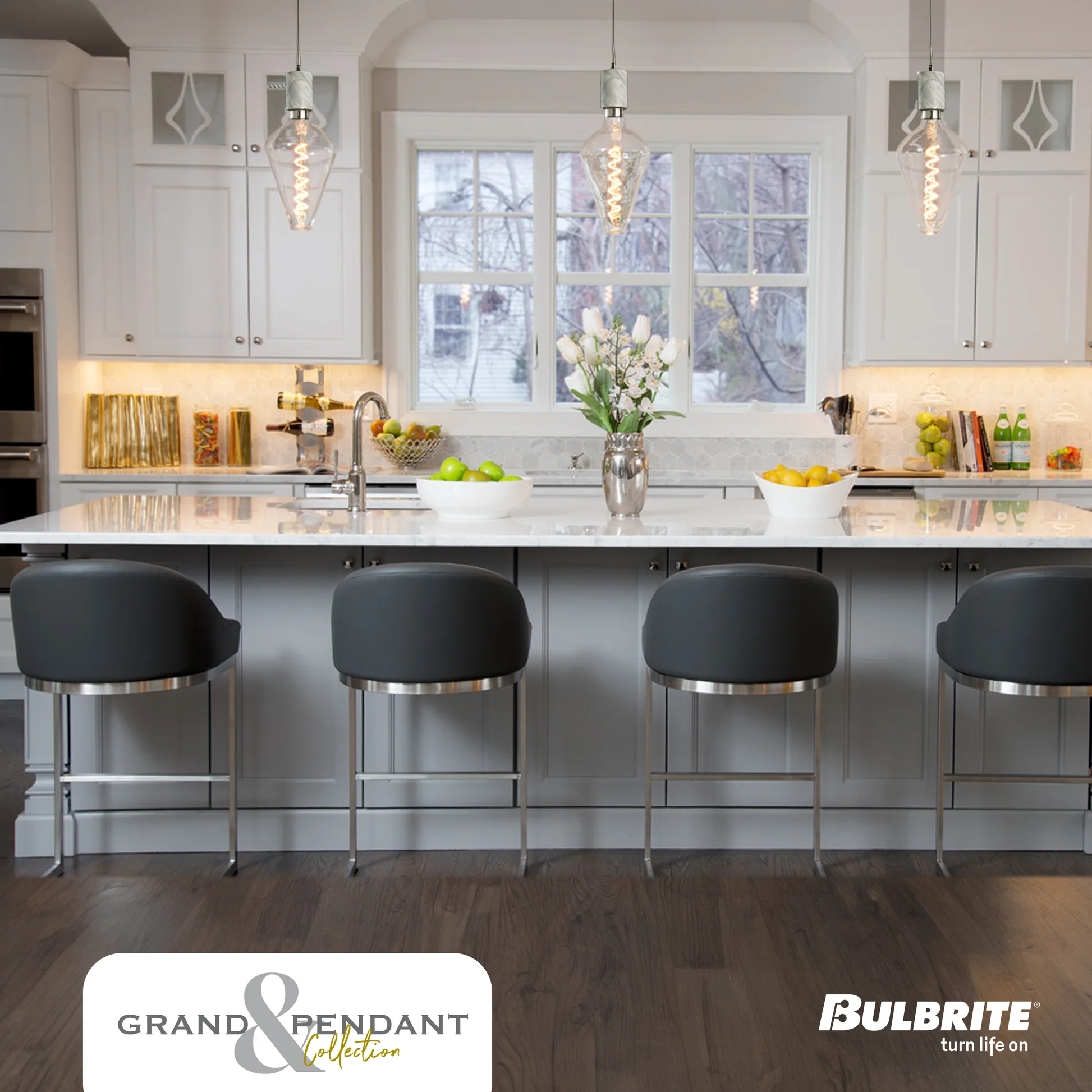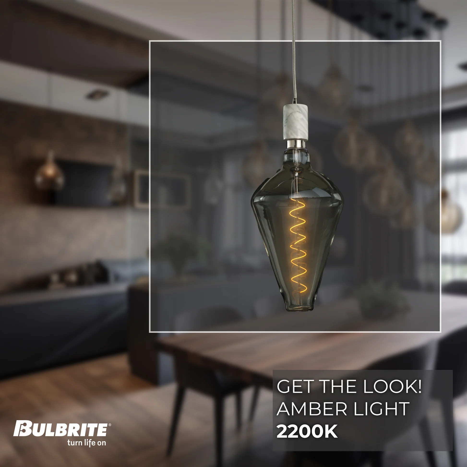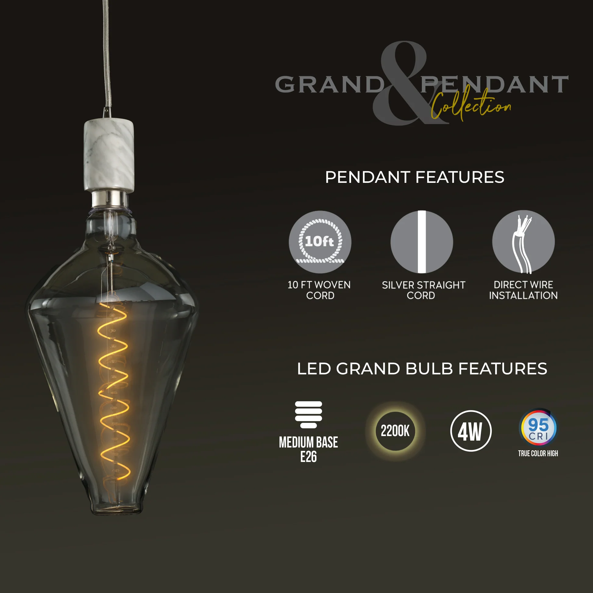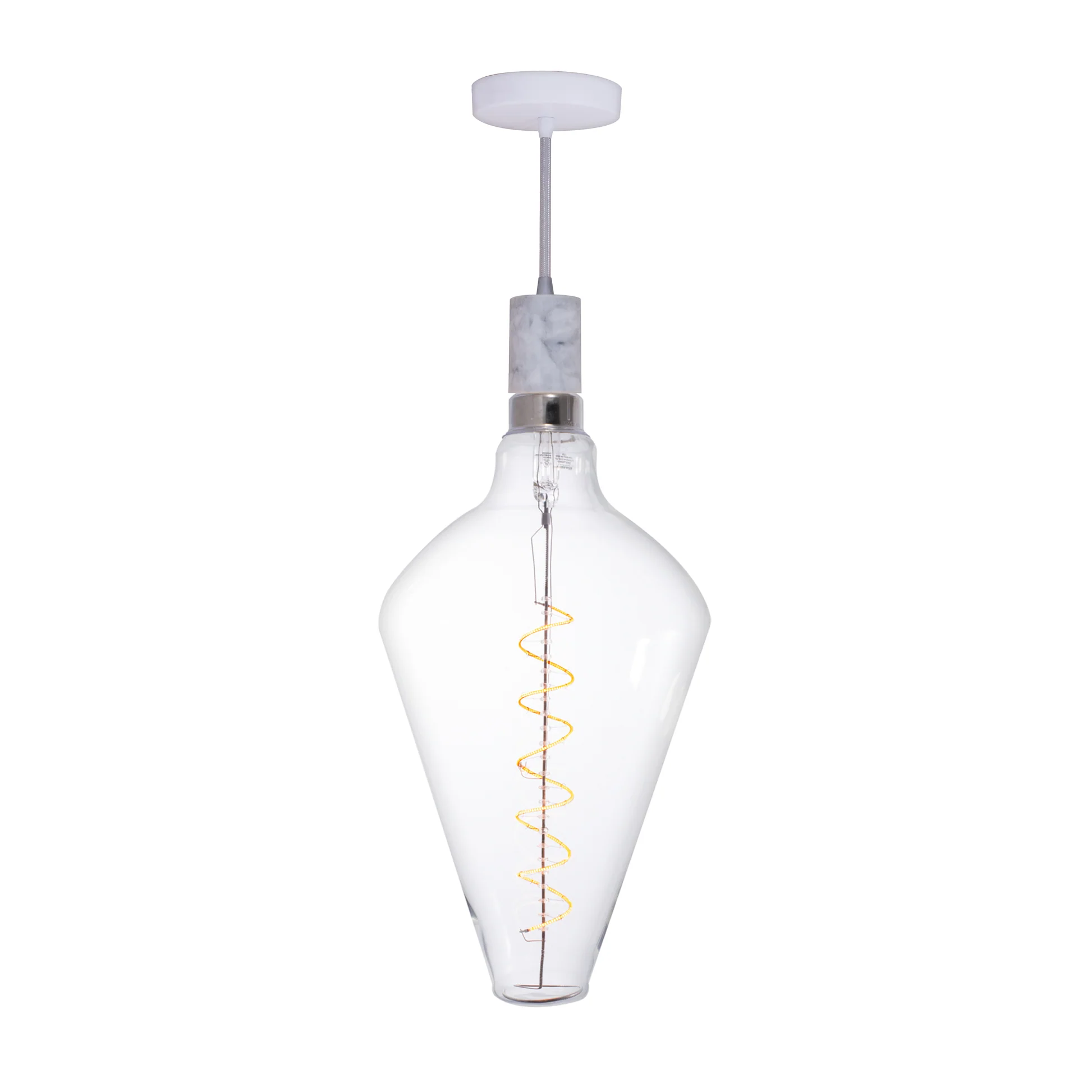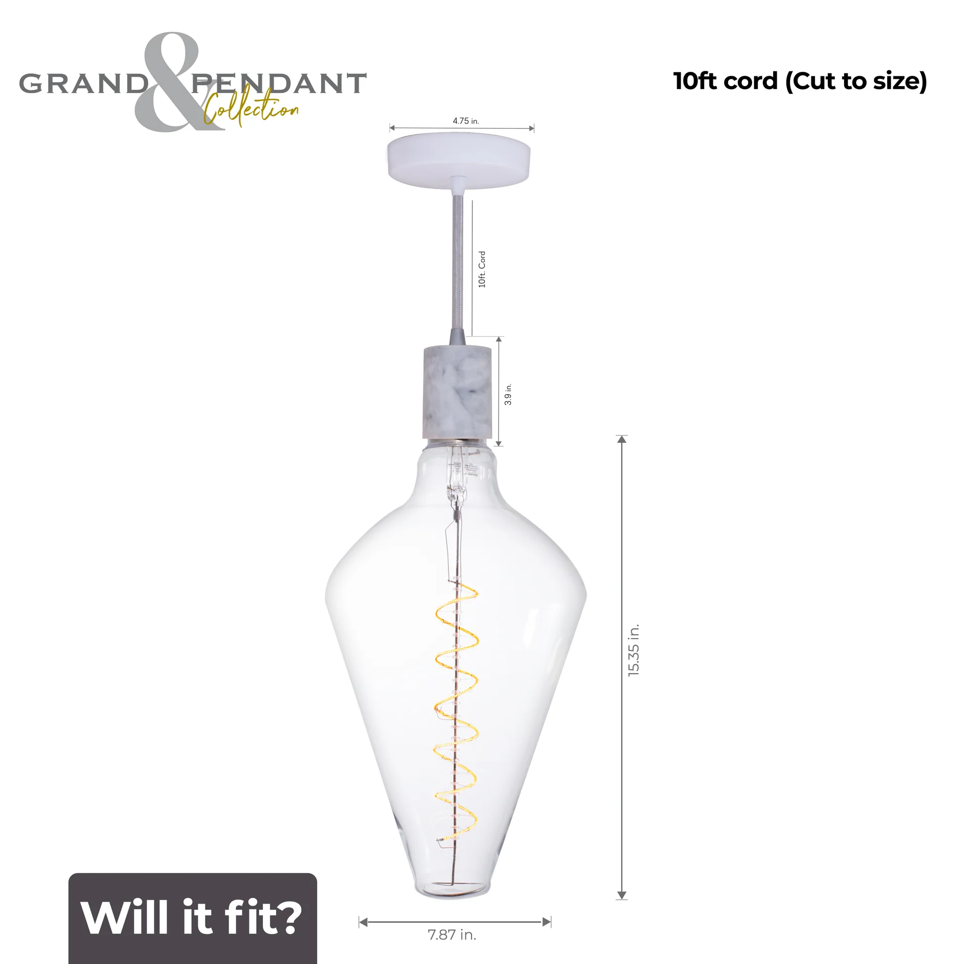 Bulbrite LED Grand Bulb and Pendant Kit of (1) 4 Watt Clear Glass 15" Diamond Shaped Bulb and (1) White Marble Open Socket Pendant on White Fabric Braided Cord - 2200K (Amber Light)