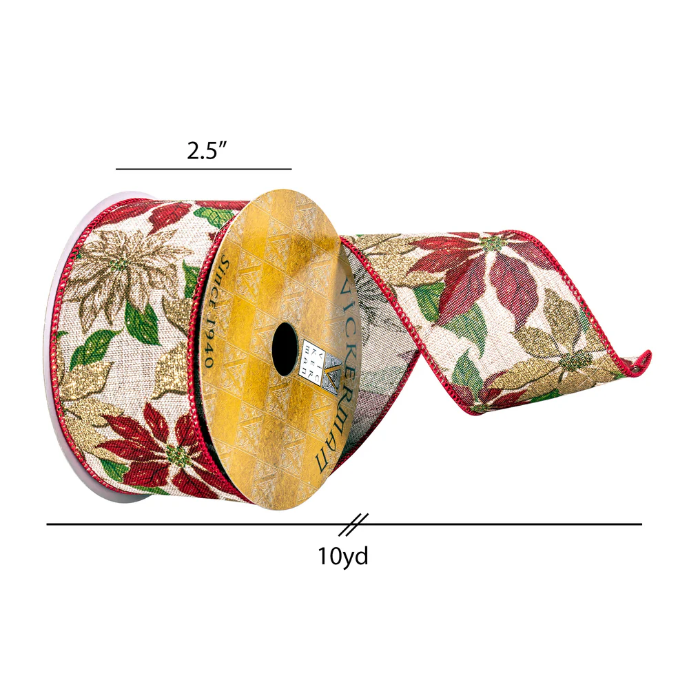 Vickerman 2.5" x 10 Yards Beige with Red and Mocha Poinsettias Ribbon