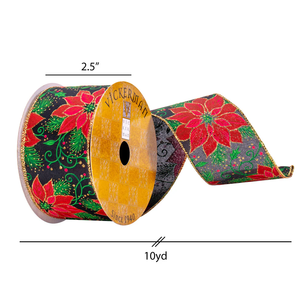 Vickerman 2.5" x 10 Yards Navy with Red Poinsettias Ribbon