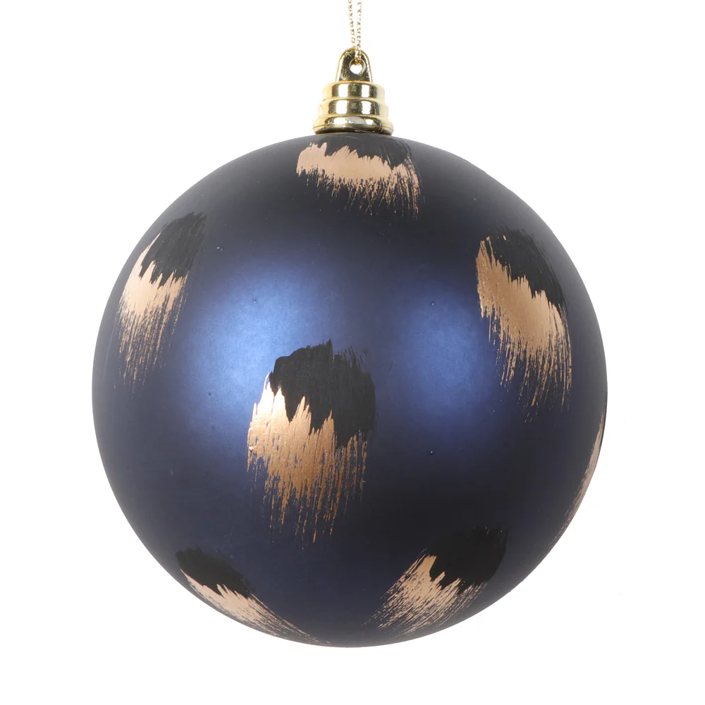 Vickerman 4" Matte Midnight Blue Ball Ornament with Gold and Black Brush Strokes 4 per bag.
