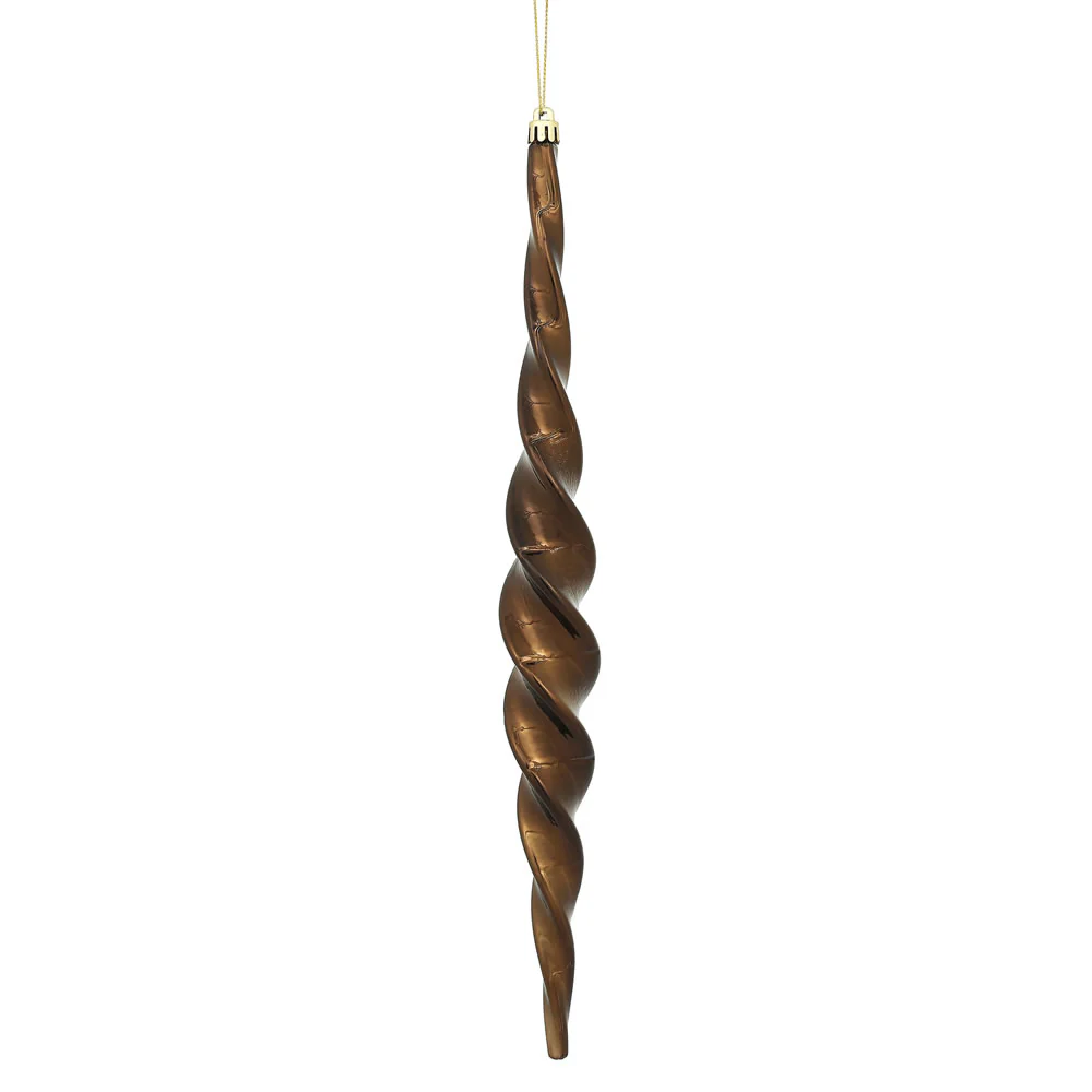 Vickerman 14.6" Chocolate Shiny Spiral Icicle Ornament with drilled and wired caps. Comes 2 per Box.
