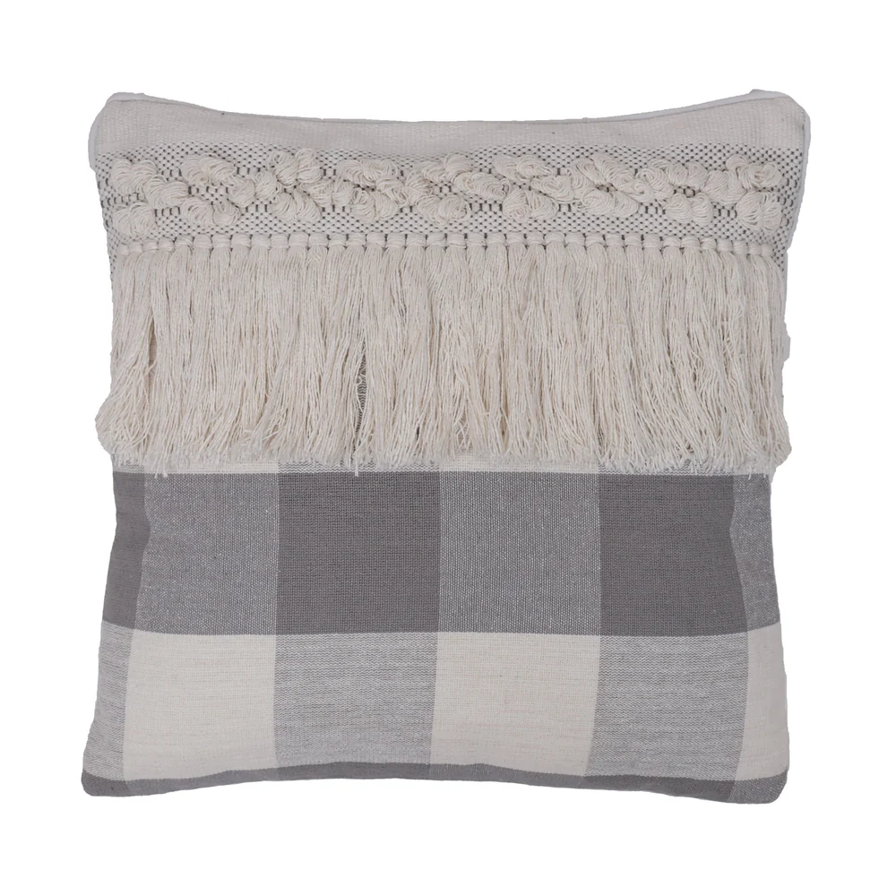 Vickerman 18" x 18" Gray Plaid with Fringe Cotton Pillow