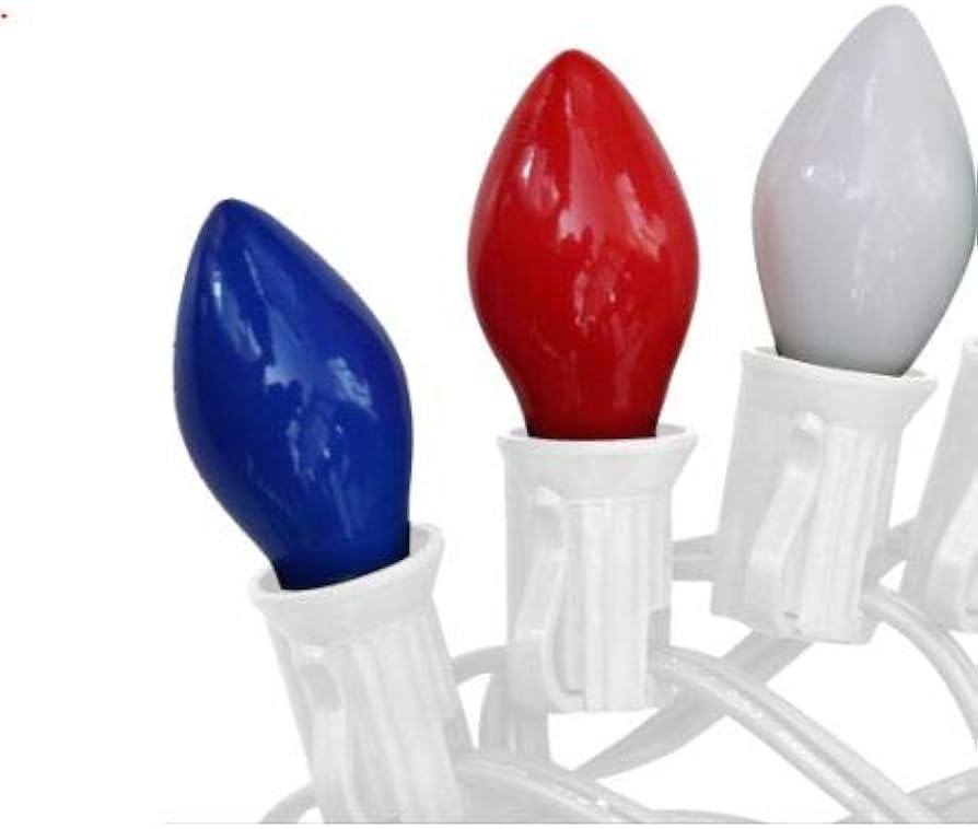 Red, White and Blue Finish Christmas Light String Set, C7 Shape, 12 Foot, Candelabra Base, Green Wire, 25 String Light with 12" Spacing Between Lights