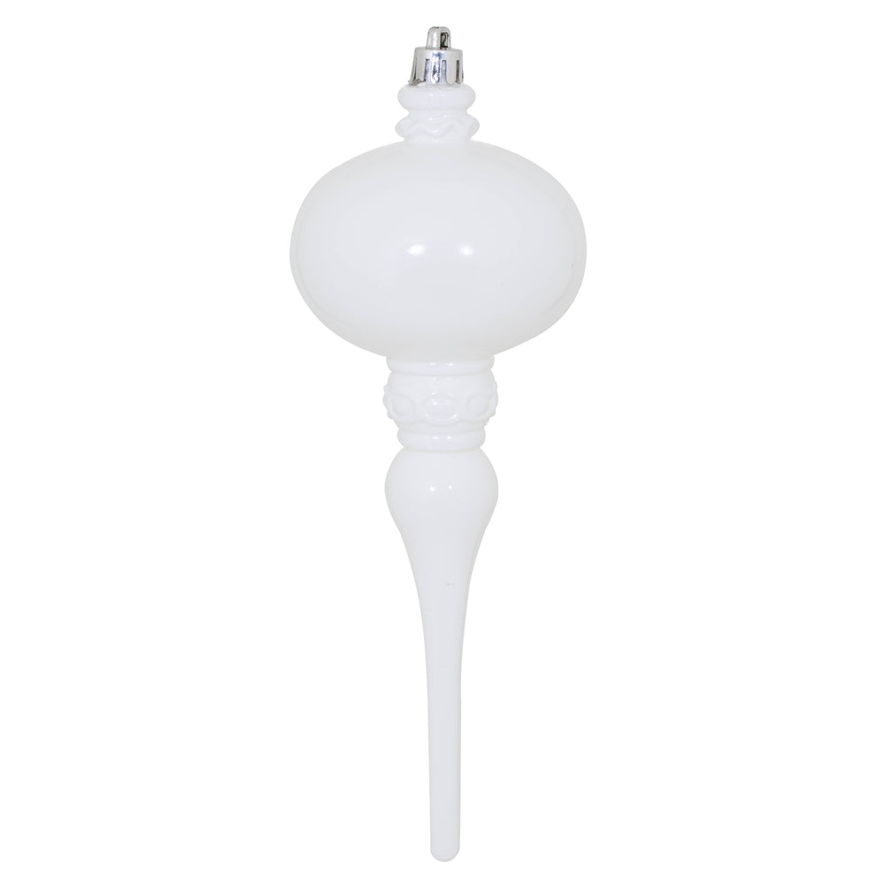 8" x 2.75" White Shiny Finial Ornament with drilled and wired caps. Comes 3 per Bag.