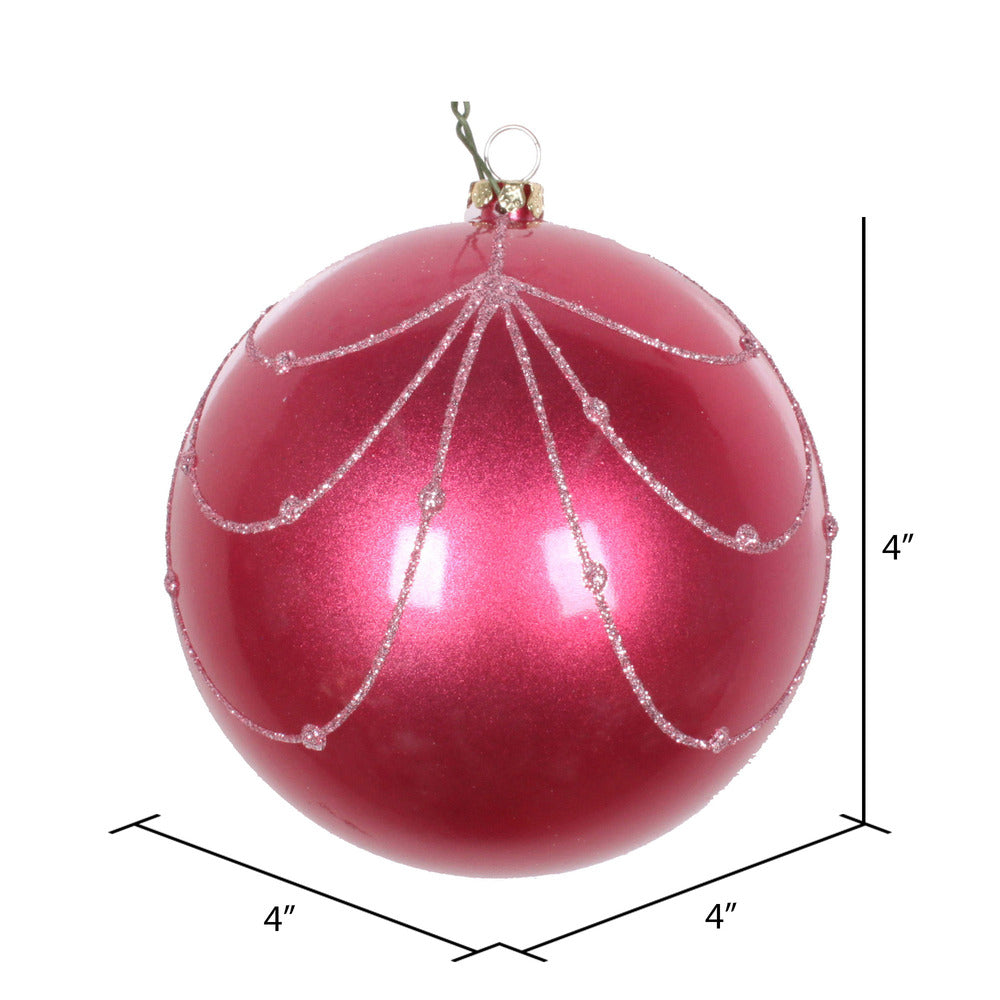 Vickerman 6" Pink Matte Ball with Glitter Diamond Pattern. Add variety and sparkle to your holiday arrangement with this matte ornament that features a glitter pattern. Includes 3 pieces per bag. Made with shatterproof plastic. Ornament has a drilled