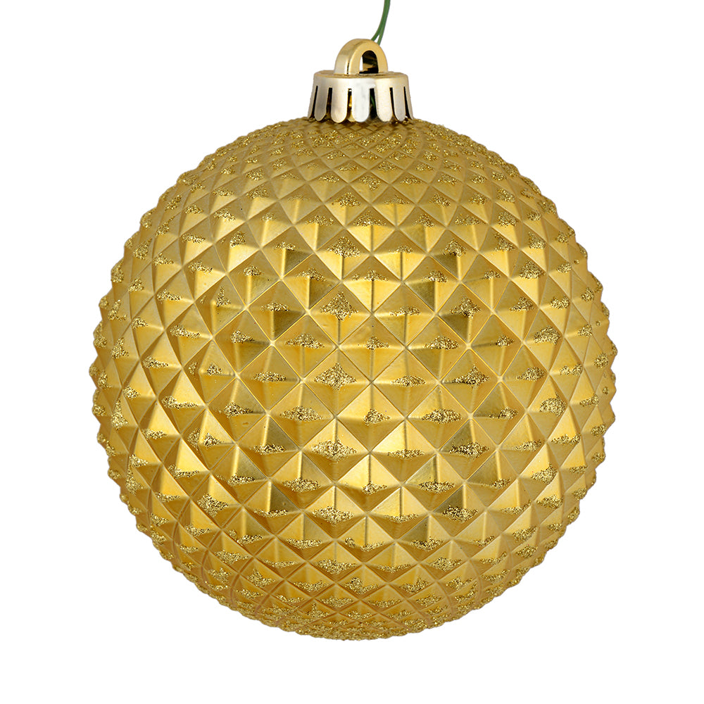Vickerman 4" Limestone Matte Ball with Glitter Diamond Pattern. Add variety and sparkle to your holiday arrangement with this matte ornament that features a glitter pattern. Includes 4 pieces per bag. Made with shatterproof plastic. Ornament has a dr