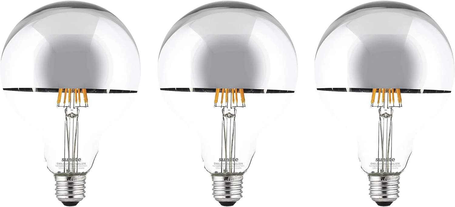 Sunlite 41605 LED G40 (G125) Edison Half Chrome Globe Light Bulb, 7 Watts (75W Equivalent), 600 Lumens, Standard E26 Base, Dimmable, Decorative Silver Bowl, Anti-Glare 3 Pack, 2700K Warm White