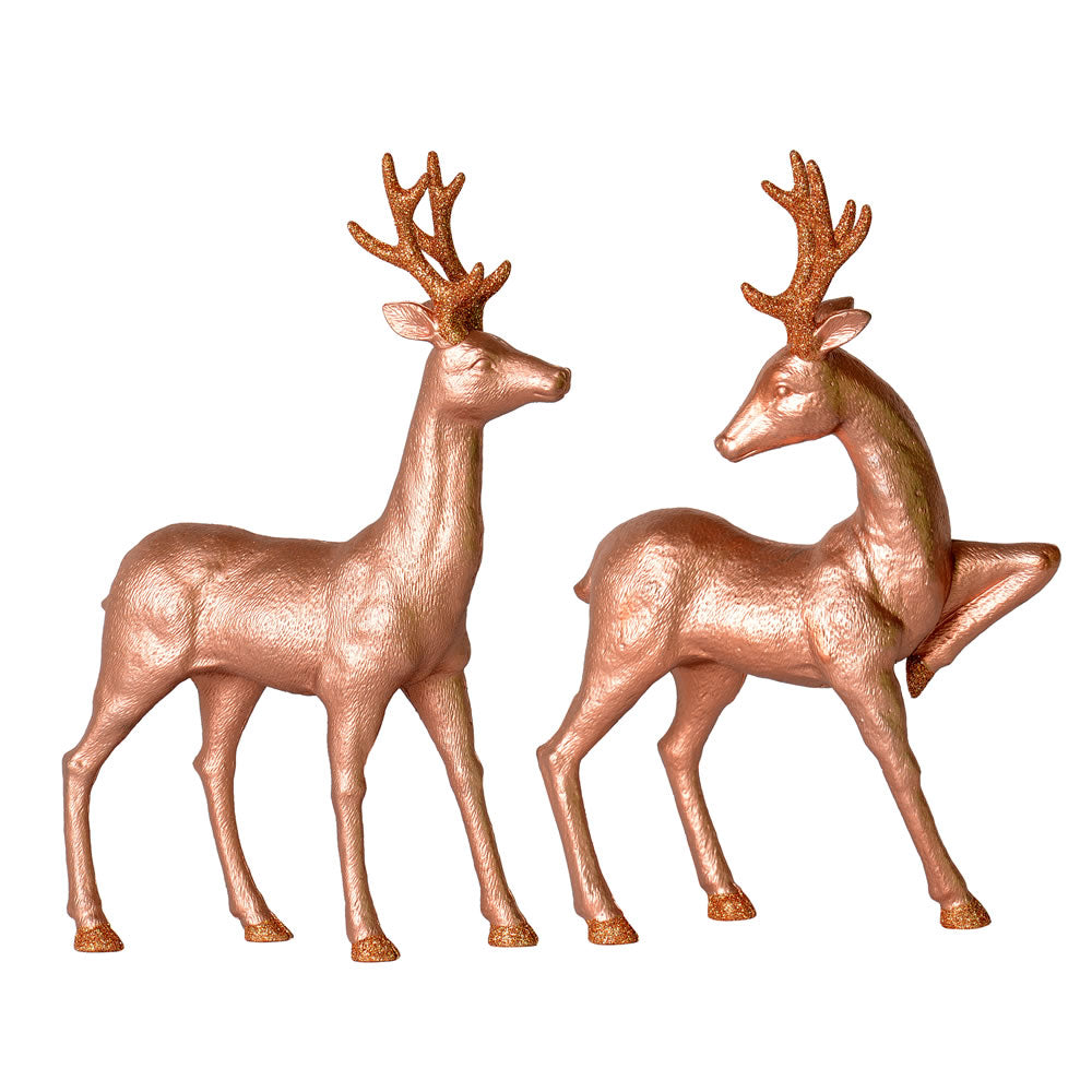 Vickerman 13" Rose Gold Deer Set with Glitter. This assortment of two includes one standing deer and one pointing deer. These feature glitter accents on the antlers and hooves.