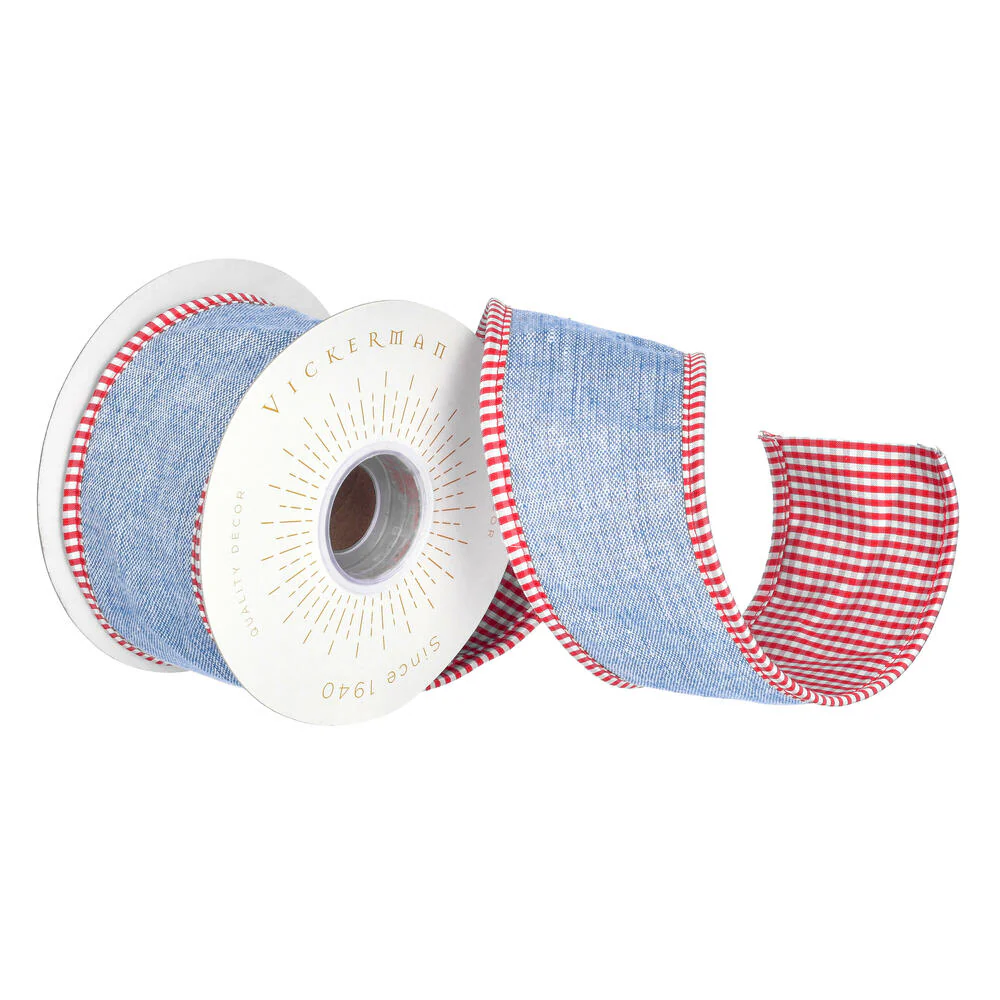 Vickerman 2.5" x 5 Yards Blue Blue Chambry Taffeta Checks Fused Piping Ribbon.