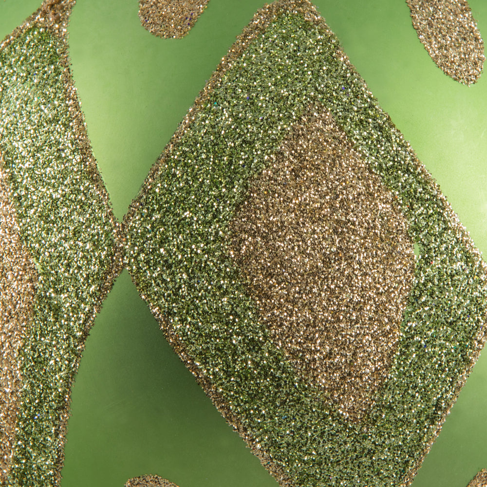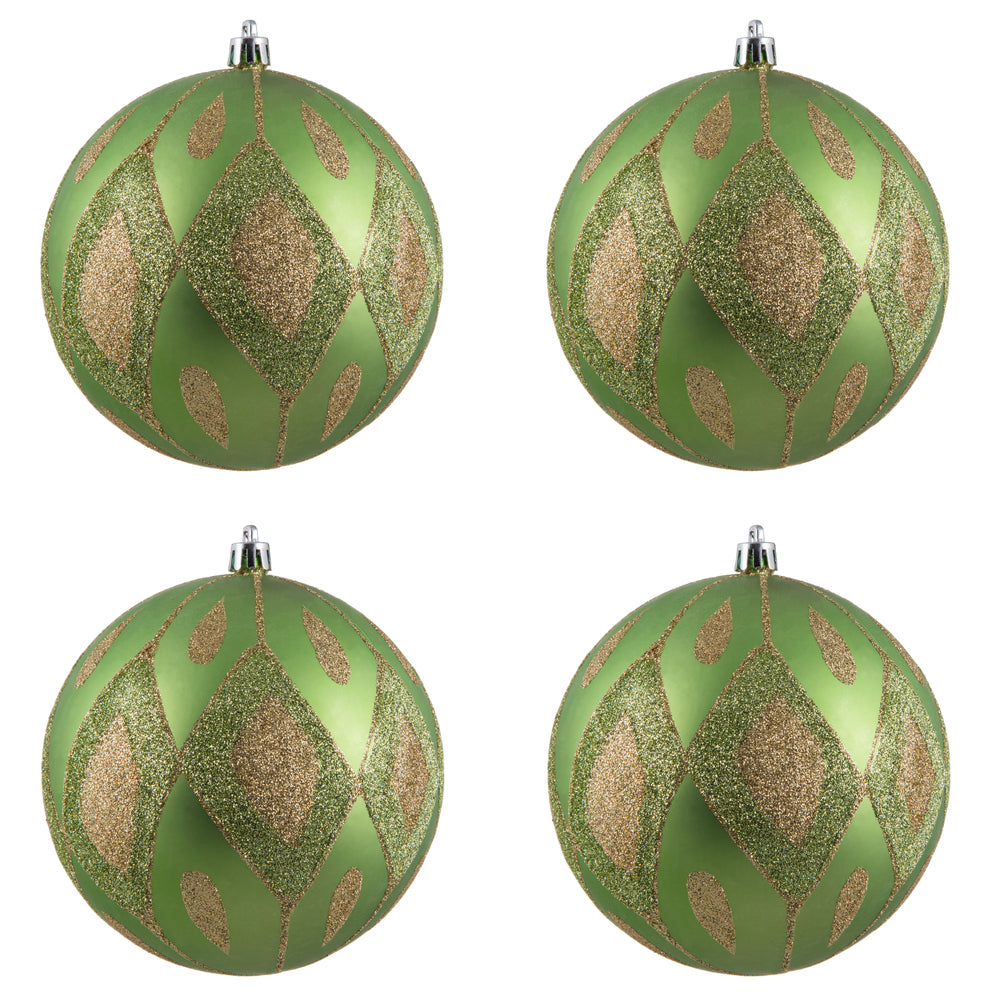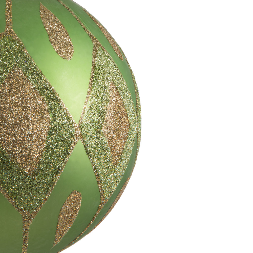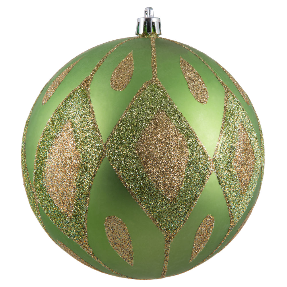 Vickerman 4.75" Celadon Matte Ball with Glitter Diamond Pattern. Add variety and sparkle to your holiday arrangement with this matte ornament that features a glitter pattern. Includes 4 pieces per bag. Made with shatterproof plastic. Ornament has a d