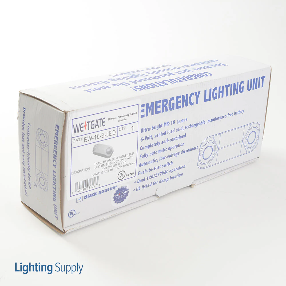 Westgate Thermoplastic Emergency Light, Black Housing W. Adj. MR16 Lamp Heads, 90 Min., 2X5.4W, 6V, Seal..., LED Exit & Emergency Lighting, 7W Per Head