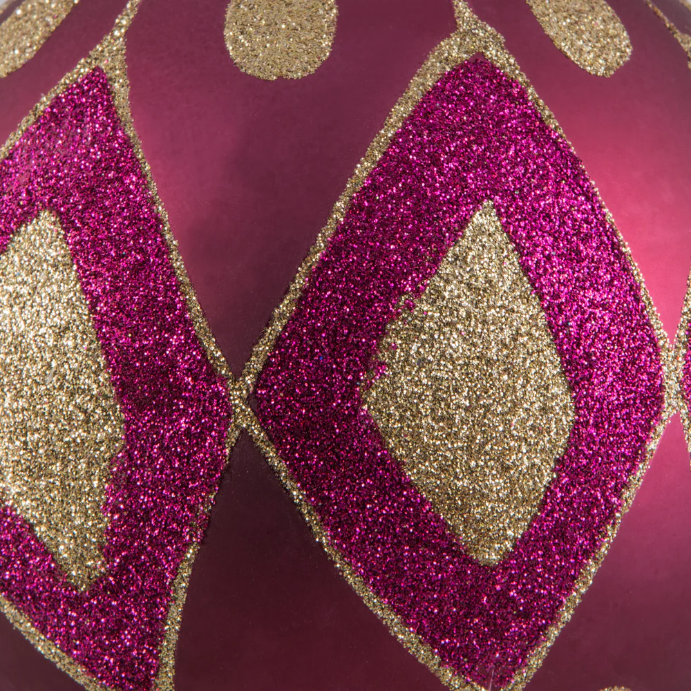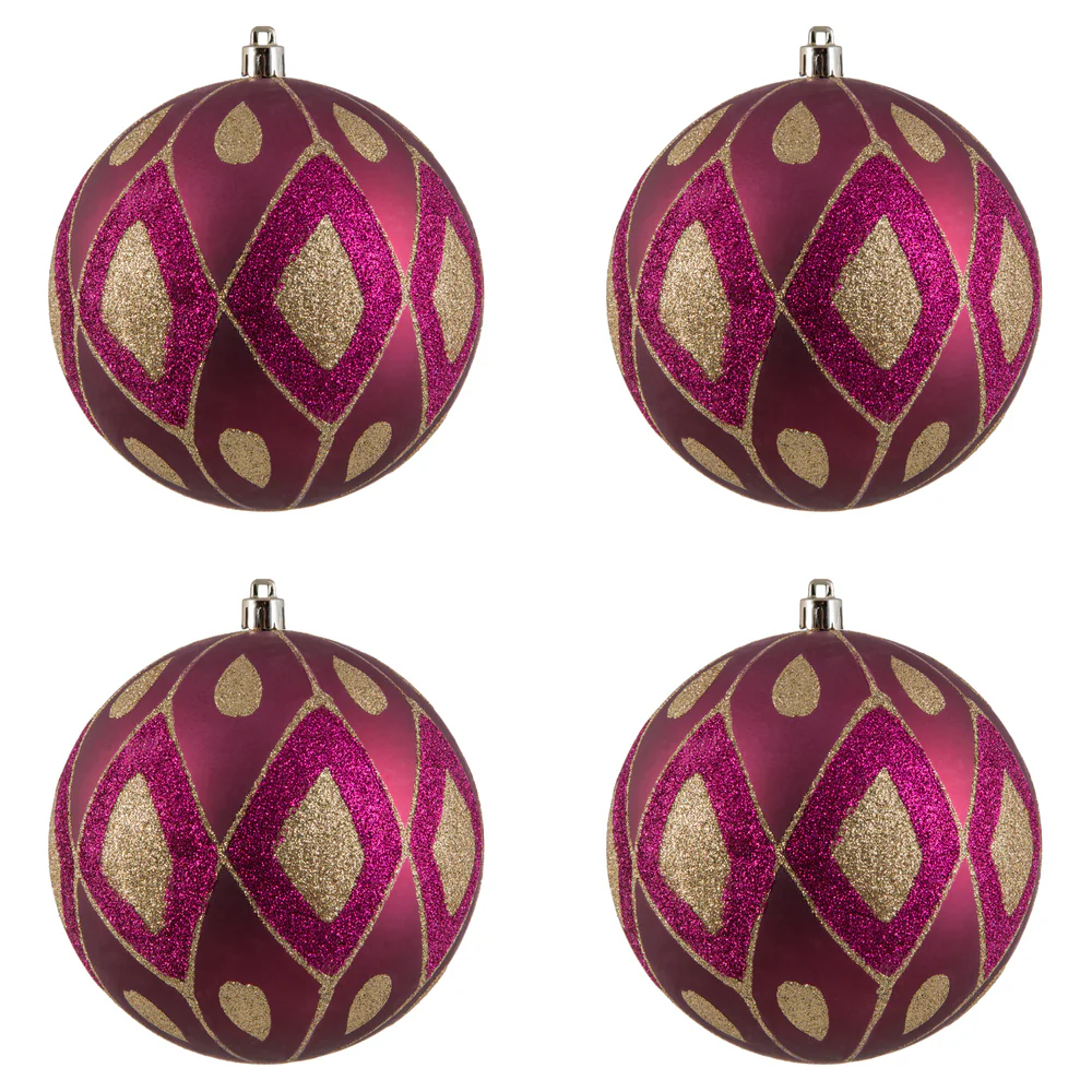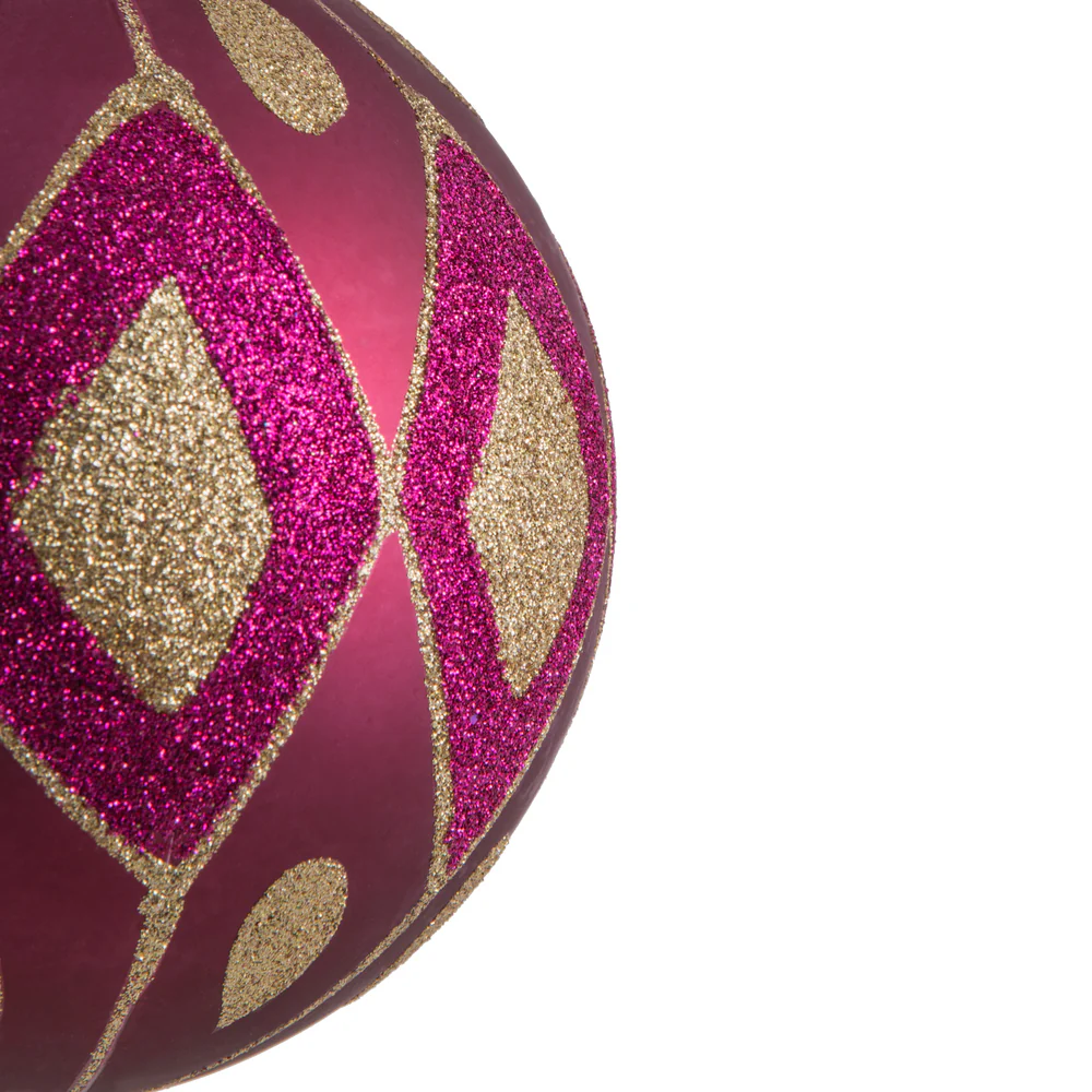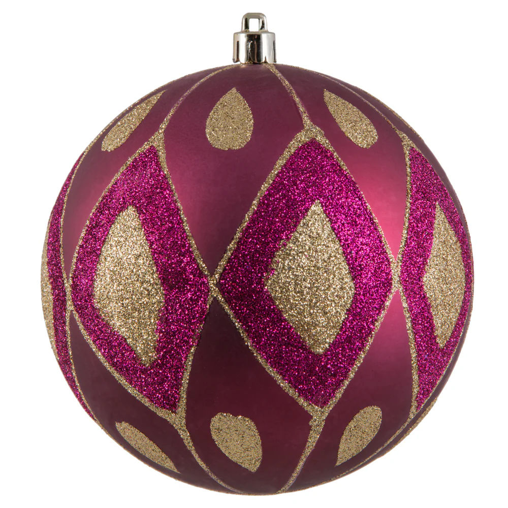 Vickerman 4.75" Berry Red Matte Ball with Glitter Diamond Pattern. Add variety and sparkle to your holiday arrangement with this matte ornament that features a glitter pattern. Includes 4 pieces per bag. Made with shatterproof plastic. Ornament has a