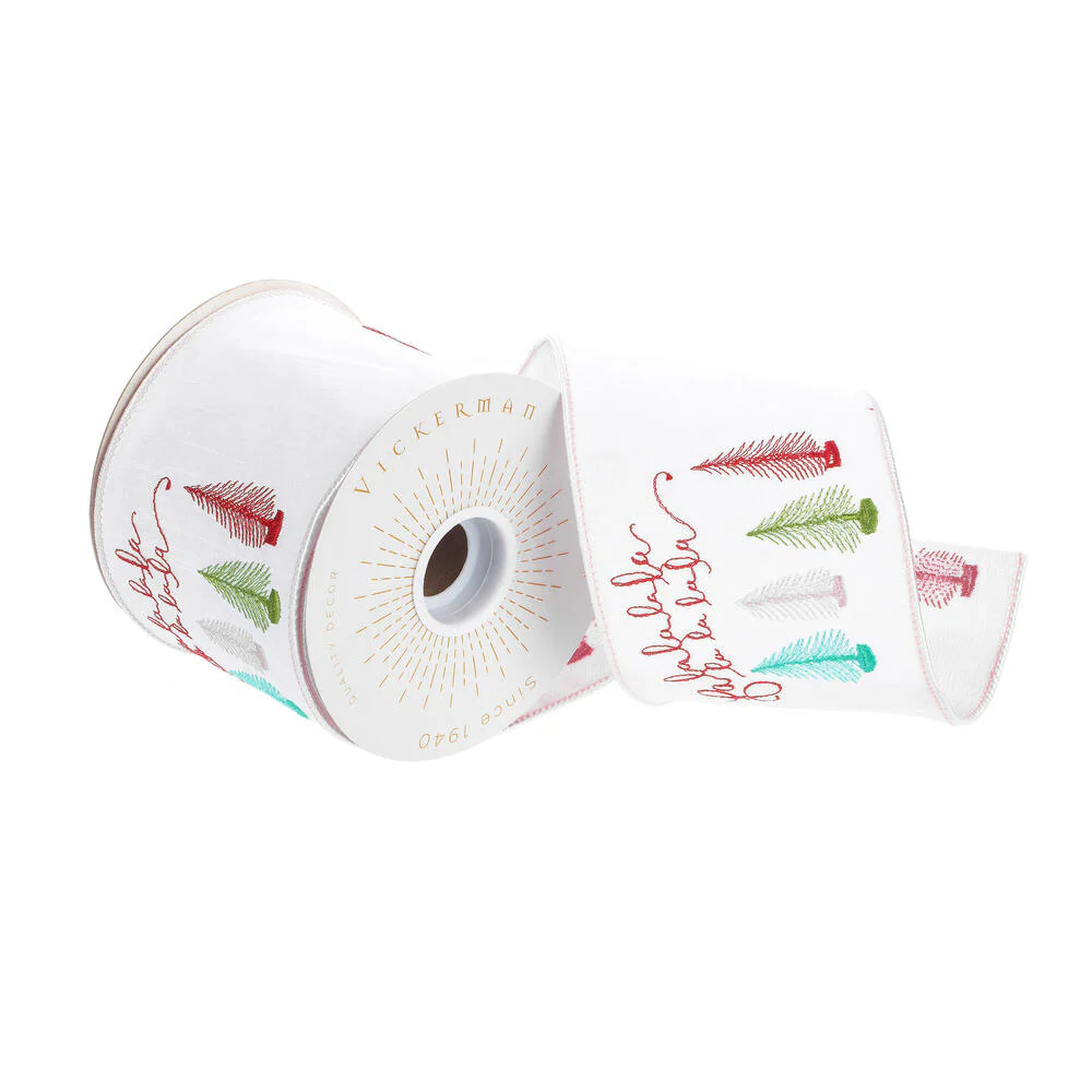 Vickerman 4" x 10 Yards "White Fa La La" Tree Wired Edge Christmas Ribbon.