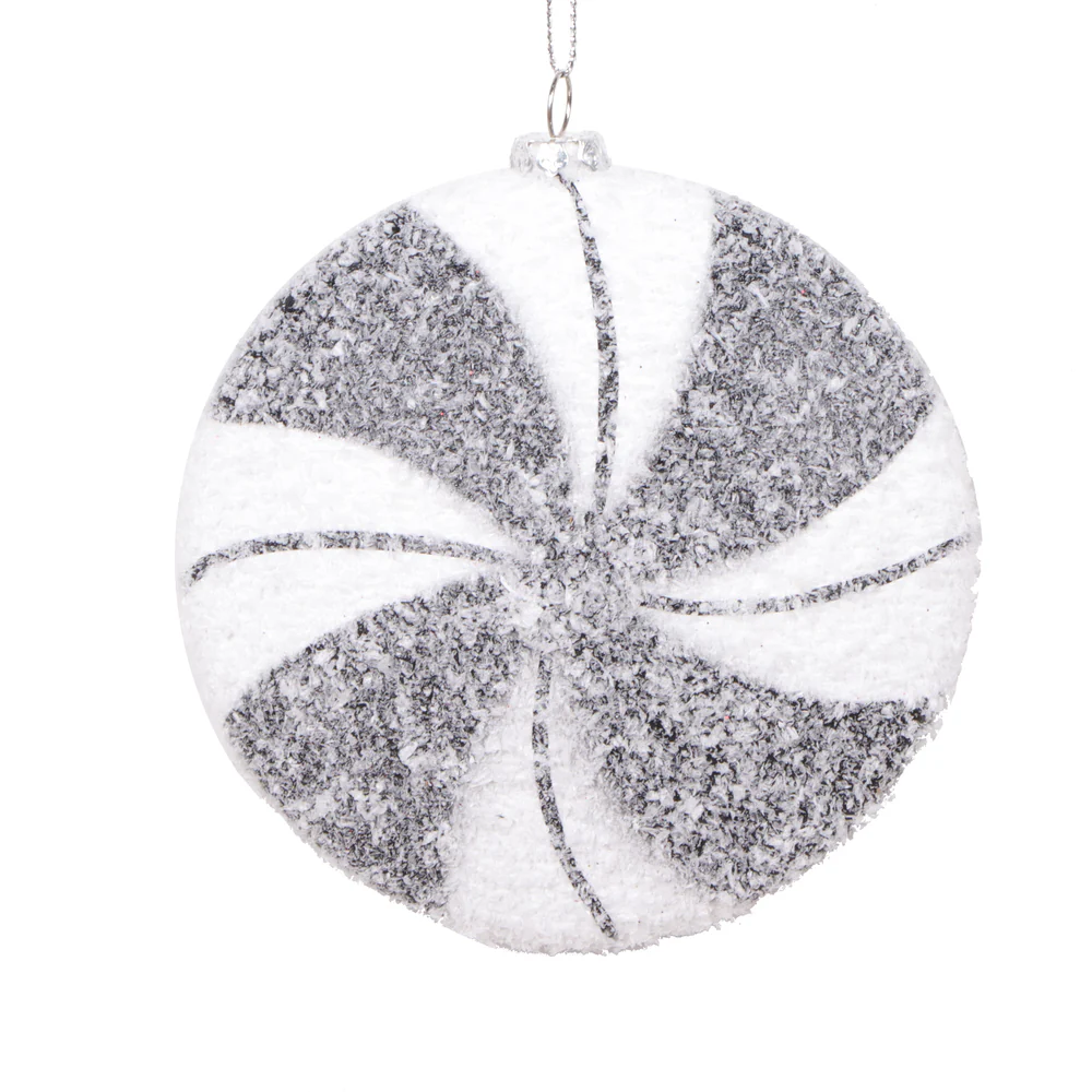 Vickerman 4" White Black Swirl Flat Ball Ornament 4 per bag.