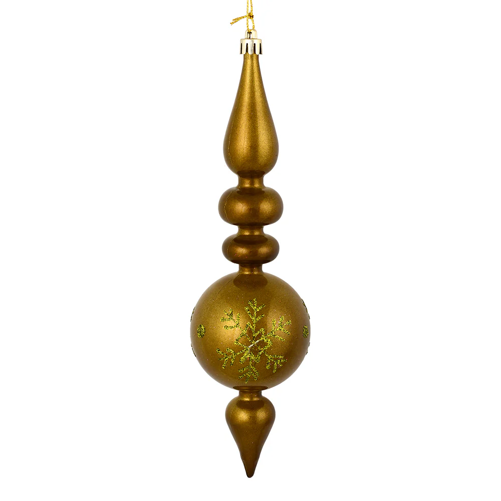 Vickerman 10 by 2.4" Olive Candy Glitter Snowflake Finial 4/Bag. Add some sparkle and shine to your holiday decorating projects with this 10 inch finial ornament. Made with shatterproof plastic. Ornament has a drilled cap secured with green floral wi