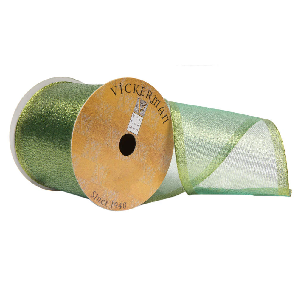 Vickerman 4" x 10 Yards Green-Gold Stripe Sheer Wired Edge Christmas Ribbon.