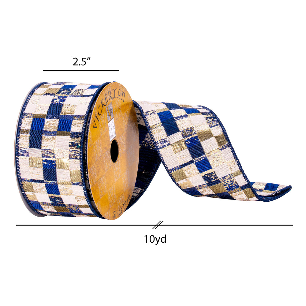Vickerman 2.5" x 10 Yards Navy with Champagne and Cream Squares Ribbon
