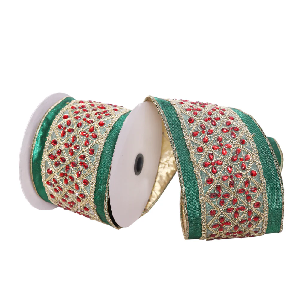 Vickerman 4" x 5 Yards Green with Red Jewels Wired Edge Christmas Ribbon.