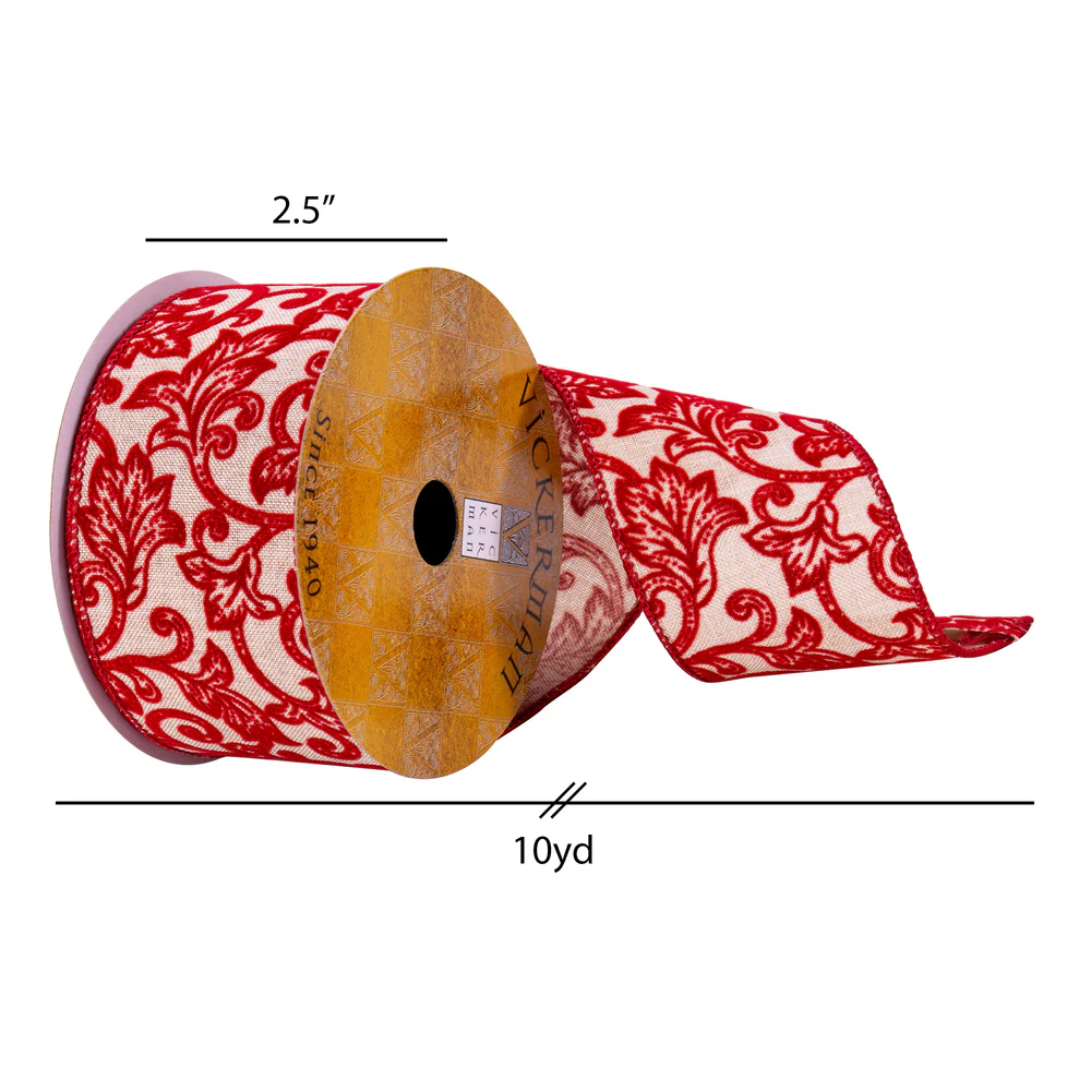 Vickerman 2.5" x 10 Yards Cream and Red Filigree Ribbon