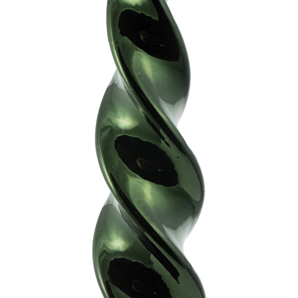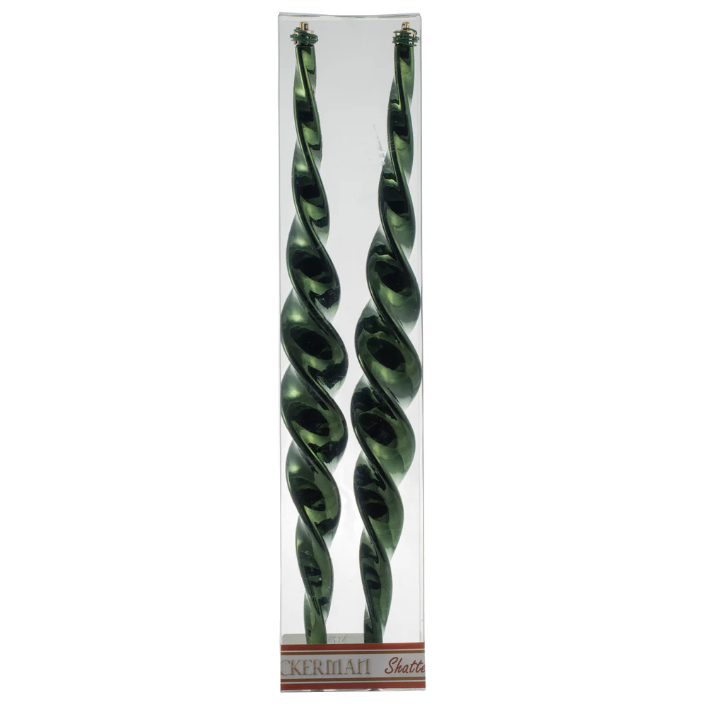 Vickerman 14.6" Moss Green Shiny Spiral Icicle Ornament with drilled and wired caps. Comes 2 per Box.