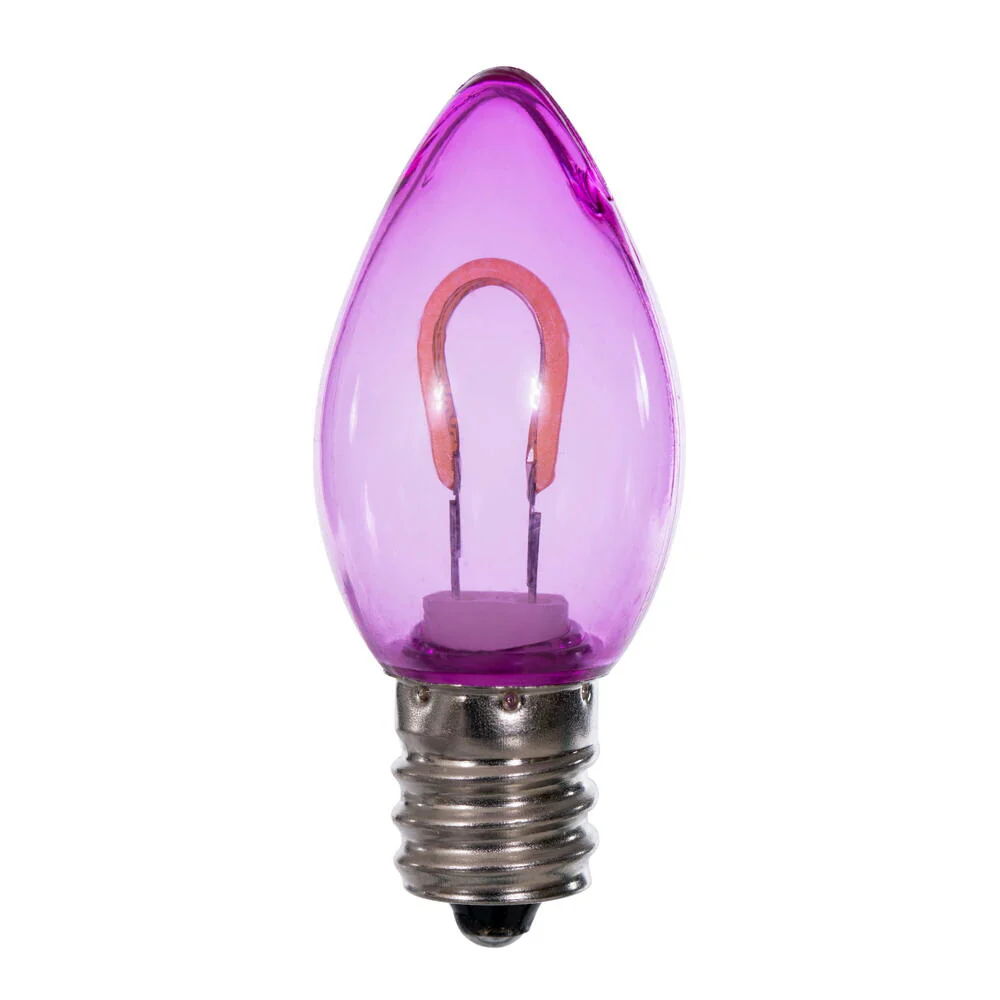 Vickerman C7 Transparent U-Shaped Filament Purple Bulb, E12 Base, .6 Watts, 25 Pcs Assorted/Bag. Colors included are Blue, Red, Green, Purple and Amber.