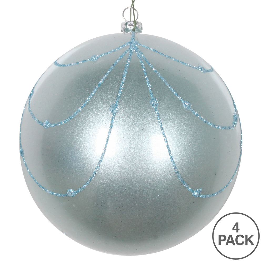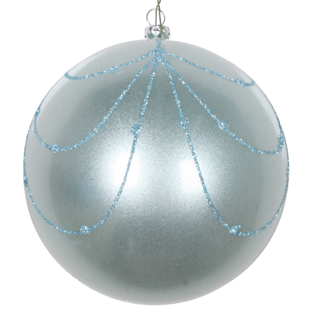 Vickerman 6" Seafoam Green Matte Ball with Glitter Diamond Pattern. Add variety and sparkle to your holiday arrangement with this matte ornament that features a glitter pattern. Includes 3 pieces per bag. Made with shatterproof plastic. Ornament has