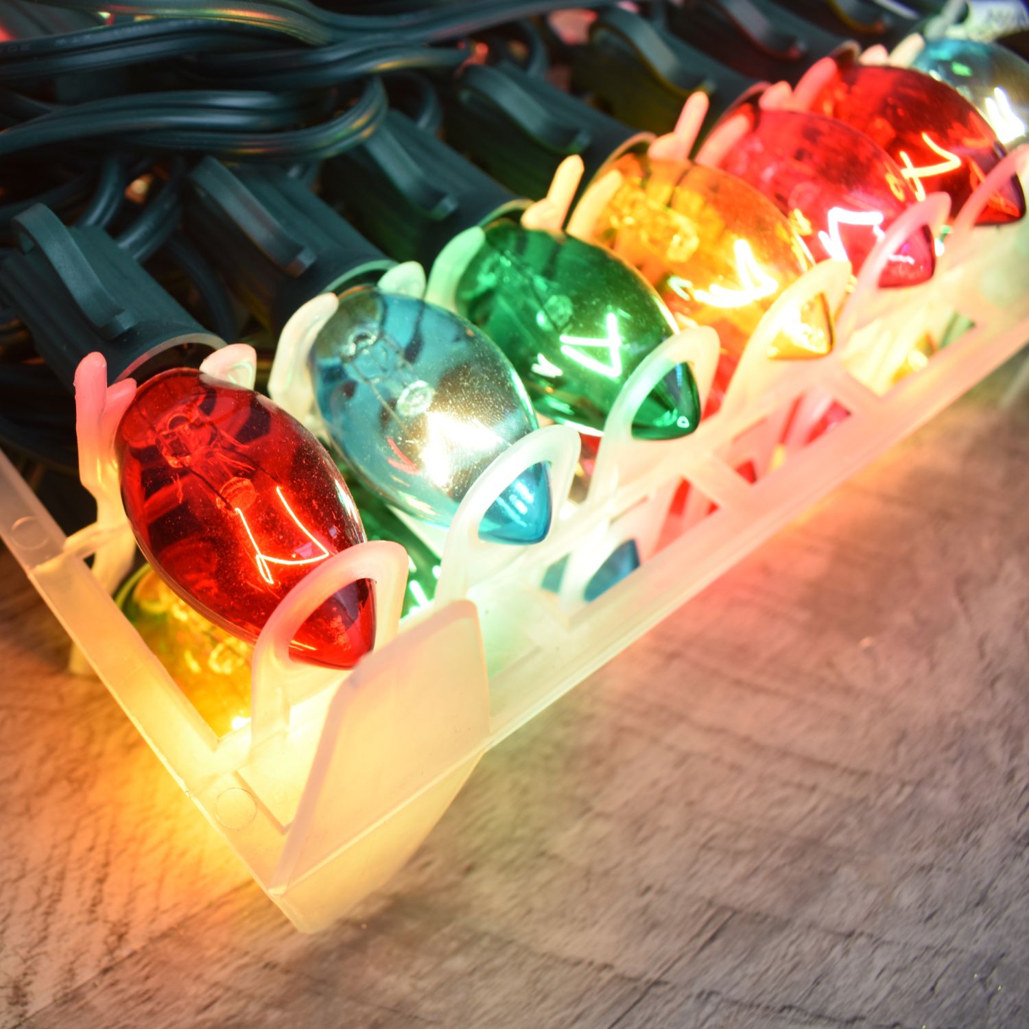 Multicolored Finish Christmas Light String Set, D1051, C7 Shape, 12 Foot, Candelabra Base, Green Wire, 25 String Light with 12" Spacing Between Lights