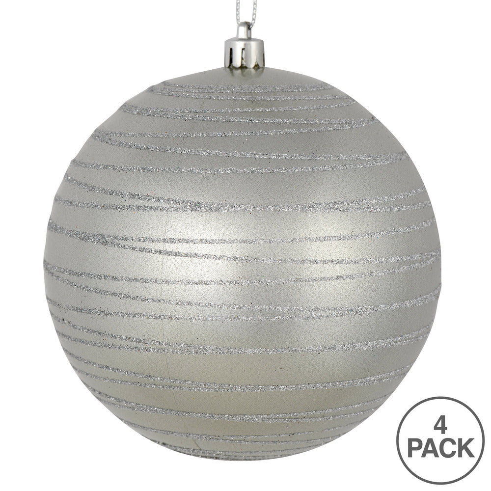 Vickerman 4" Silver Candy Finish Ball Ornament with Glitter Lines 4 per Bag