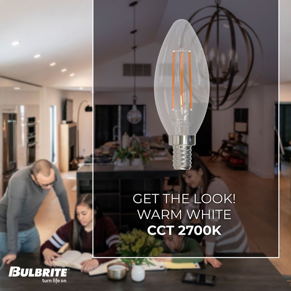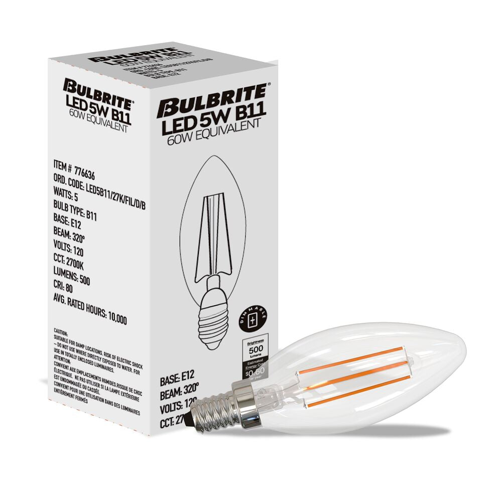 Bulbrite 5 Watt B11 LED Filament Light Bulb, 2700K E12 Candelabra Base, Clear Finish, Pack of 24