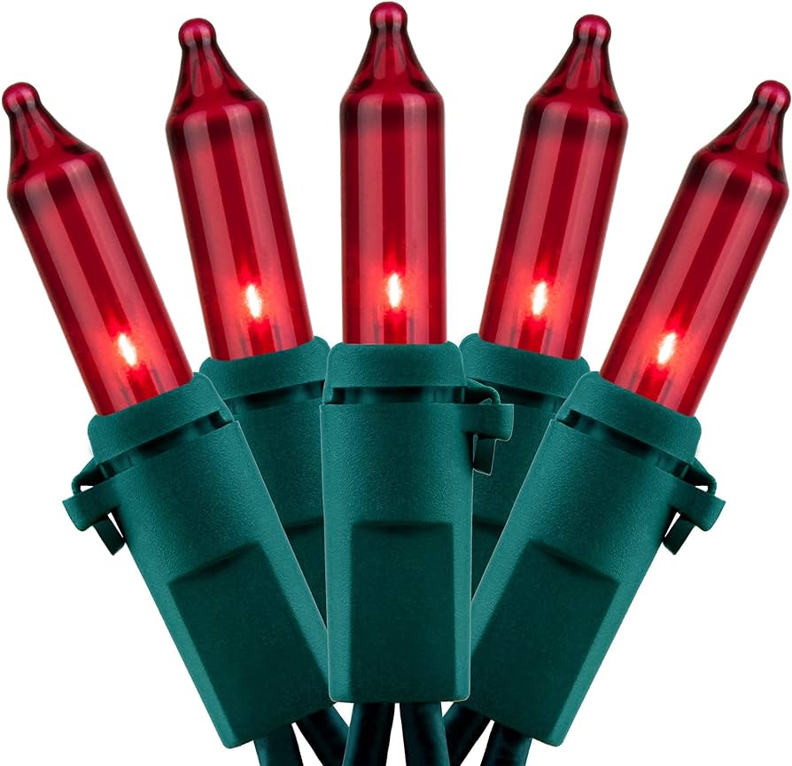 Transparent Red Christmas Tree Mini Lights, 50 Lights, T1 3/4 Shaped, 16 Foot, Green Wire, Steady Burning and Flashing