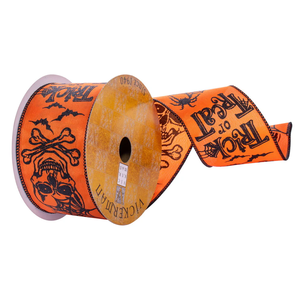 Vickerman 2.5" x 10 Yards Orange Skull and Spiderweb Ribbon.