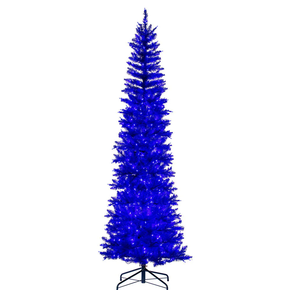 Vickerman 9.5' x 42" Blue Pencil Artificial Pre-Lit Christmas Tree with 700 Dura-Lit® Warm White LED Mini Lights. It measures 114 inches tall, and 28 inches wide, which is considered a pencil profile. This tree boasts 1700 tips for a realistic look.