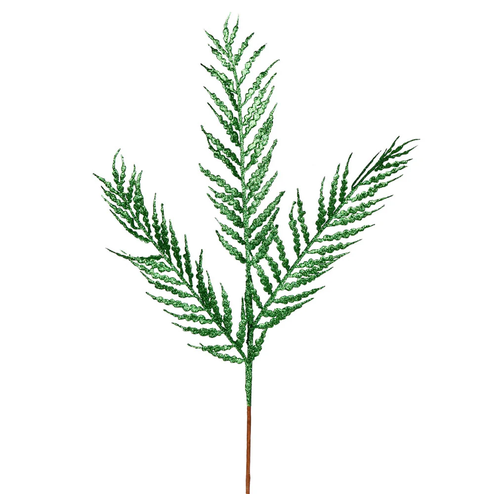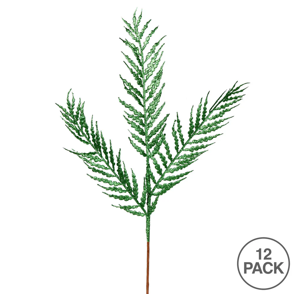 Vickerman 21" Green Glitter Feather Fern Artificial Christmas Spray. Includes 12 sprays per pack.