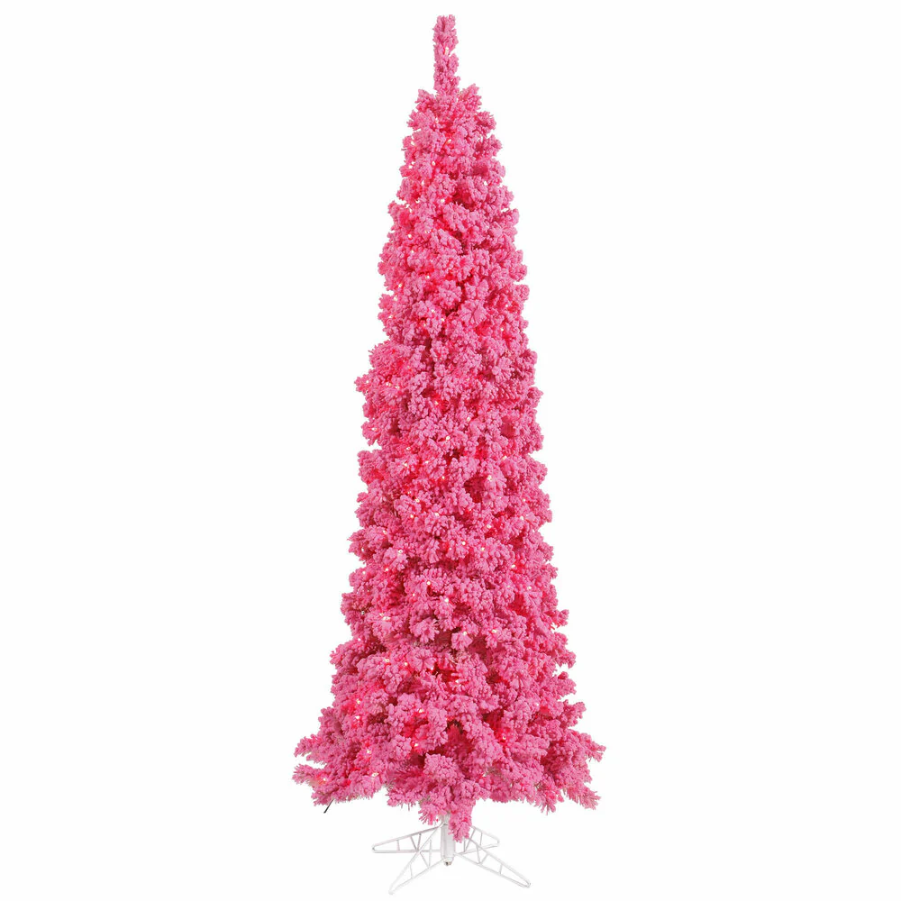Vickerman 7.5' Flocked Pink Pencil Fir Artificial Christmas Tree Pink Dura-lit LED Lights