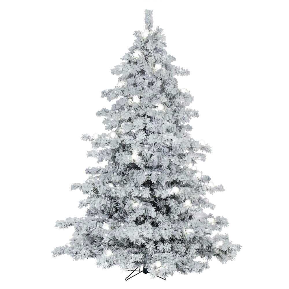 Vickerman 7.5' x 68" Flocked Alaskan Artificial Pre-Lit Christmas Tree with 49 Pure White G40 and 800 Pure White LED Mini Lights, 1505 Flocked Realistic PVC Tips, 6' Step On/Off Power Cord and Folding Metal Tree Stand. Assembly is required.