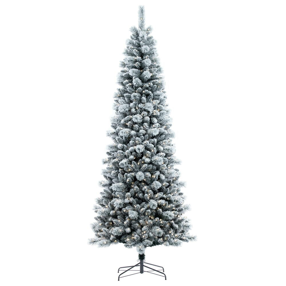 Vickerman 9' x 46" Flocked White Pine Artificial Slim Pre-lit Christmas Tree with 750 Dura-Lit® Warm White LED Mini Lights. It measures 108 inches tall and 46 inches wide, which is considered a slim profile. This tree boasts 1258 tips for a realistic